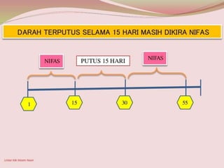 Dokumen tersebut membahas berbagai hukum Islam yang berkaitan dengan wanita hamil dan nifas, termasuk tentang wanita hamil menghampiri mayat, menjaga aurat, haid selama hamil, kewajiban solat, dan masalah wilayah dan nifas. Dokumen ini juga memberikan panduan cara solat bagi wanita hamil dan sakit seperti solat duduk, berbaring, dan mengiring serta membahas tentang jama' solat.