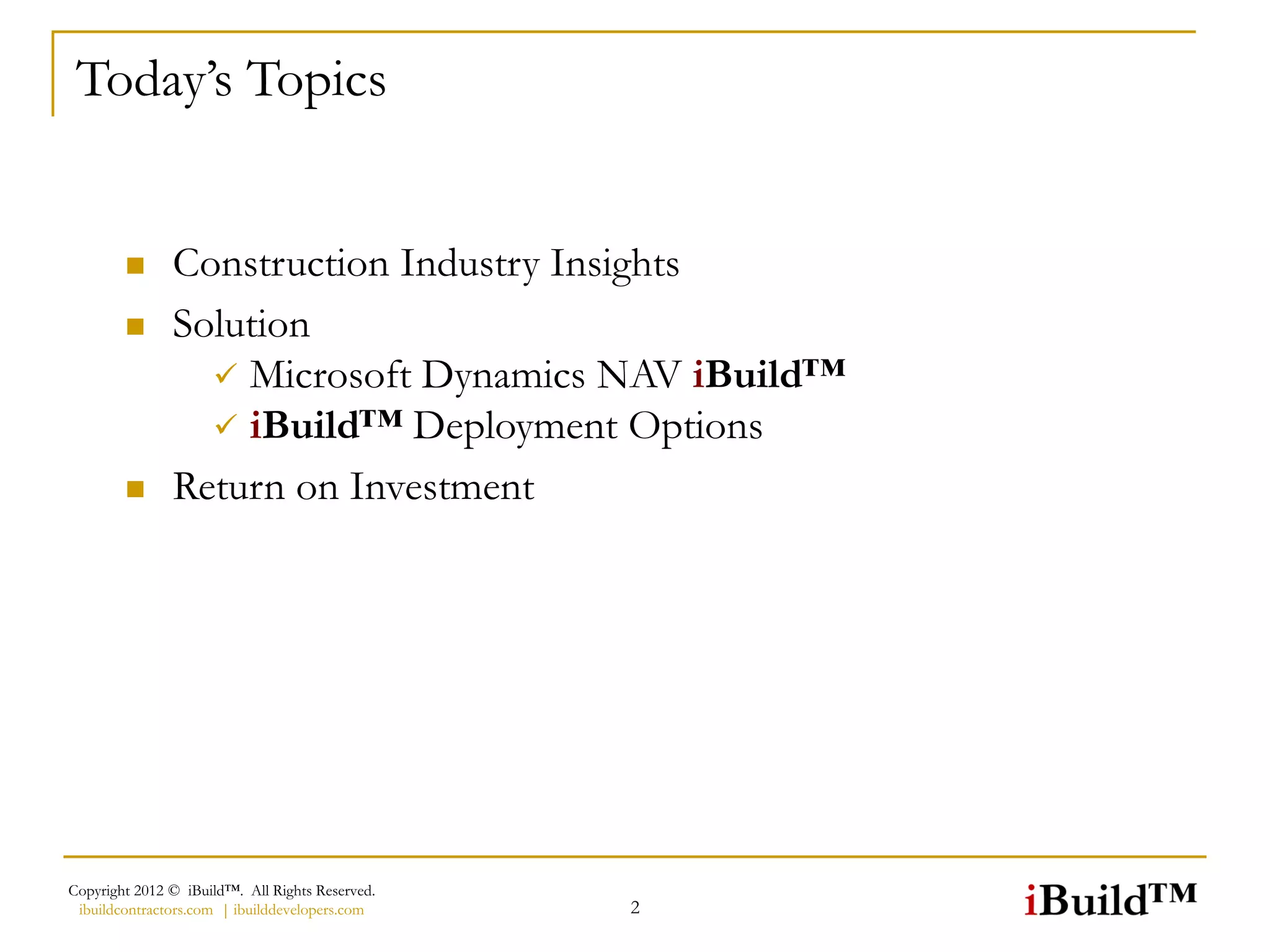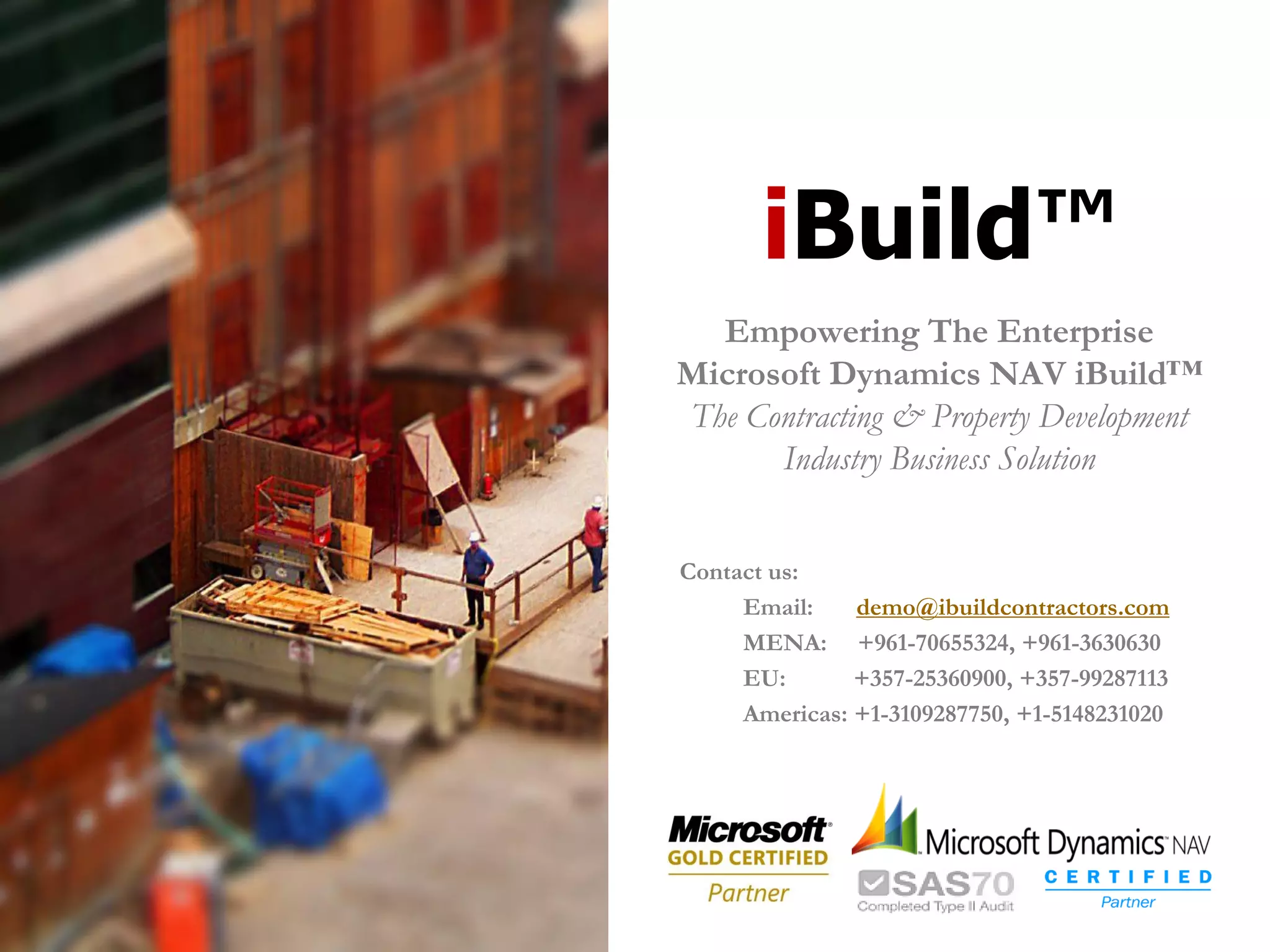 The document outlines the capabilities of ibuildtm, an ERP solution based on Microsoft Dynamics NAV, designed for the contracting and property development industry. It highlights industry challenges, the need for reliable technology, and the benefits of using Dynamics NAV, including its integration and user-friendly interface. Additionally, it emphasizes the solution's adaptability, extensive add-on options, deployment choices, and potential return on investment for clients.