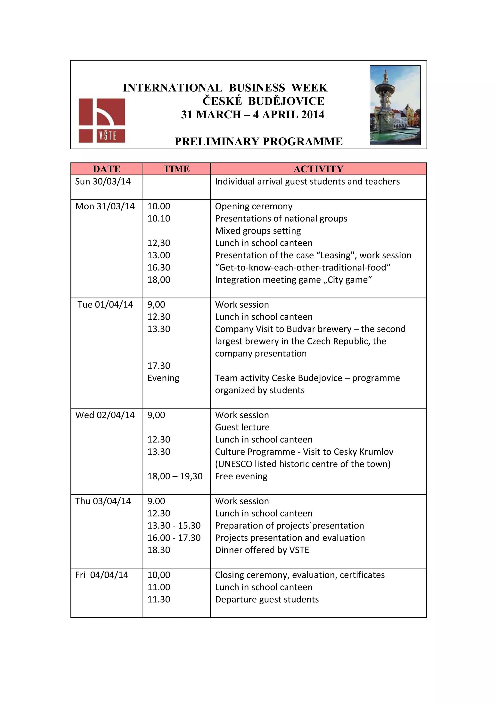 This document provides a preliminary program for an International Business Week being held in Ceske Budejovice, Czech Republic from March 31st to April 4th, 2014. The program includes an opening ceremony on March 31st, followed by presentations and team building activities. On April 1st, participants will work on assignments and visit a local brewery. The next day includes more work, a guest lecture, and a cultural visit. April 3rd focuses on project preparation and presentations. The week concludes on April 4th with a closing ceremony before participants depart.