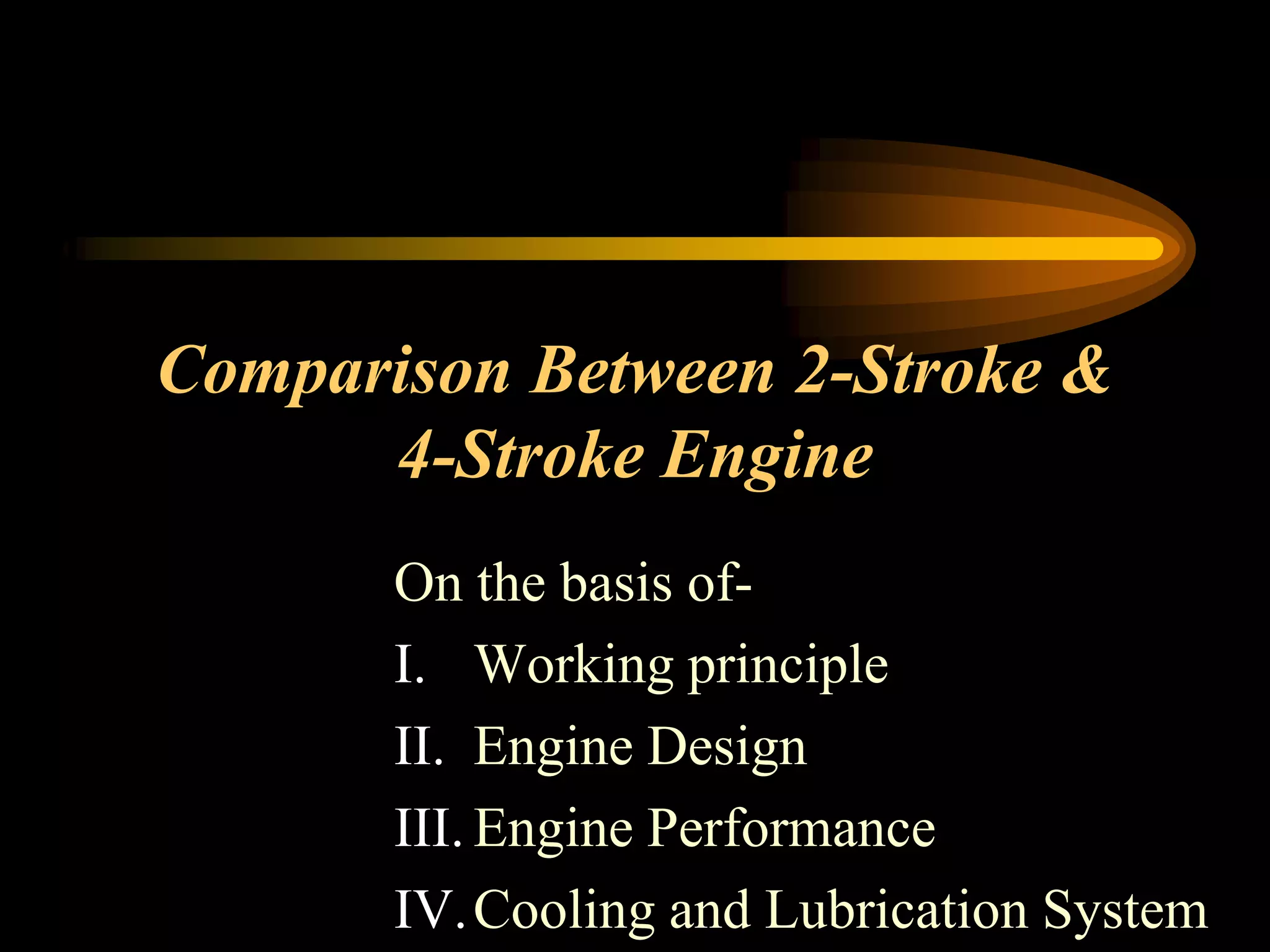 The document compares 2-stroke and 4-stroke engines across several factors. 4-stroke engines have an intake, compression, power, and exhaust stroke per cycle. They are heavier with valves but have higher efficiency. 2-stroke engines have a power stroke every revolution due to ports, making them lighter but less efficient due to incomplete exhaust scavenging causing pollution. Cooling and lubrication are more critical for 2-stroke engines due to their higher revolutions per minute. Overall, 4-stroke engines are more widely used except for small vehicles due to their better performance and lower fuel consumption.