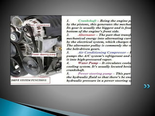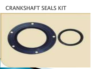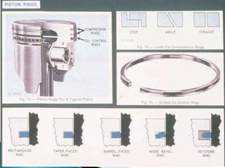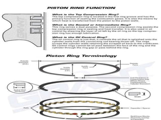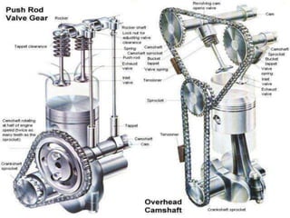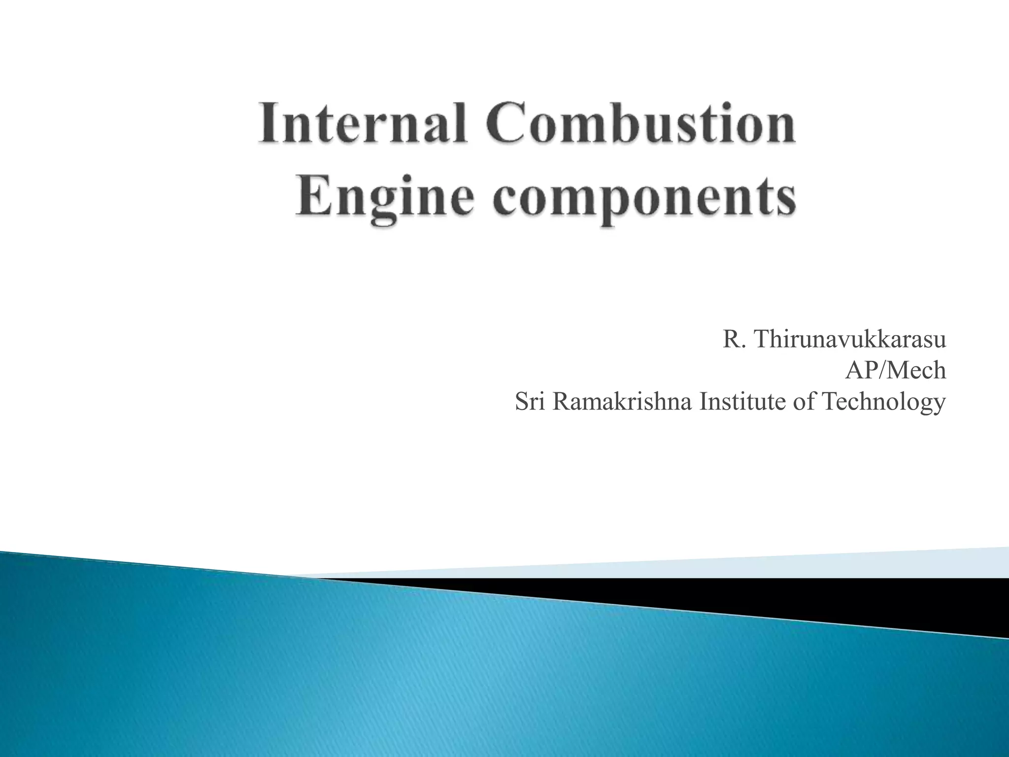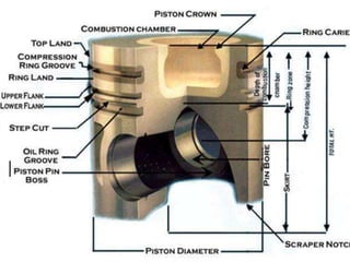 This document summarizes the key components of an internal combustion engine, including: the cylinder head, engine block, oil pan/sump, pistons, connecting rods, crankshaft, camshaft, valves, manifolds, and other parts. It provides brief descriptions of each component and their purpose within the engine.