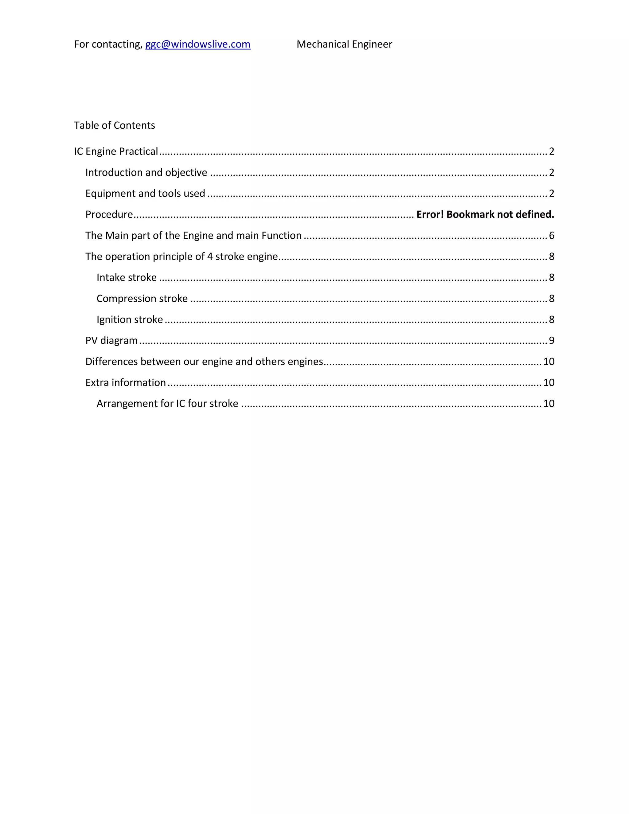 This document provides information about disassembling and reassembling an internal combustion engine. It describes the key parts of the engine and their functions. The main steps taken to disassemble the engine are cleaning it, removing the cylinder head and other components. Assembly is done in reverse order. The four strokes of the engine cycle are also explained: intake, compression, ignition, and exhaust. Differences between this engine and others are noted, such as arrangement and valve design.