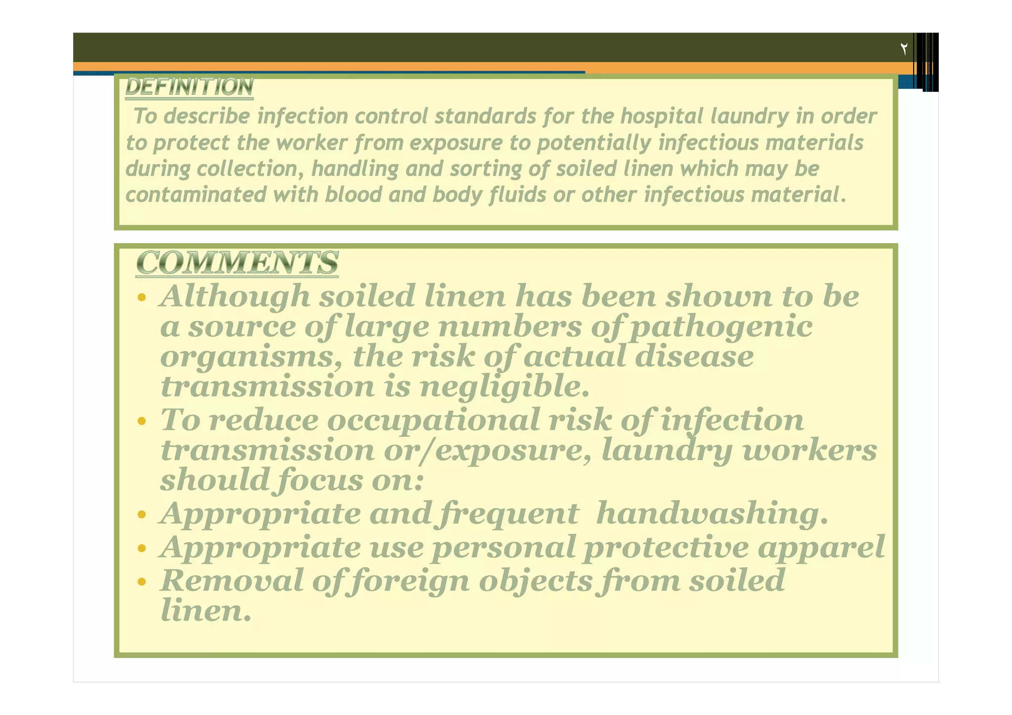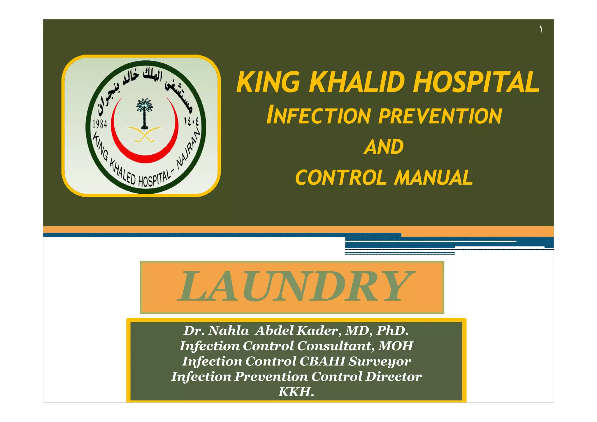 The King Khalid Hospital Infection Prevention and Control Manual outlines standards for managing hospital laundry to protect workers from infectious materials. Key practices include proper handwashing, personal protective equipment usage, and minimizing agitation of soiled linen to prevent contamination. Additionally, it provides guidelines for washing, transporting, and storing clean linen to minimize microbial exposure.