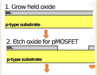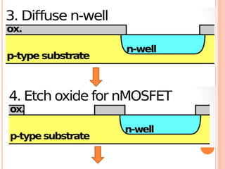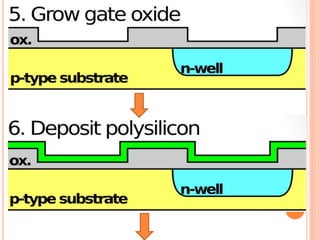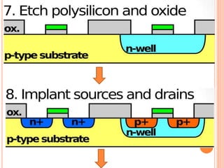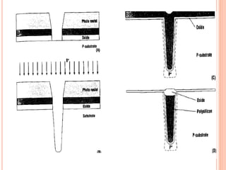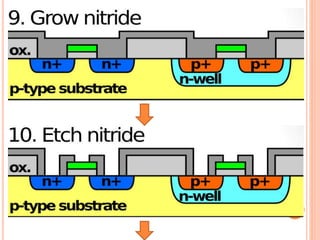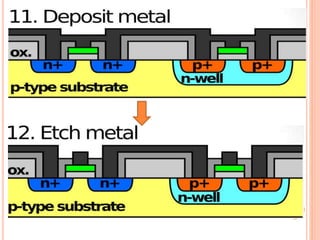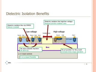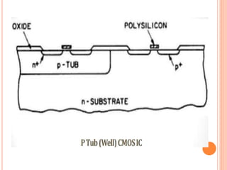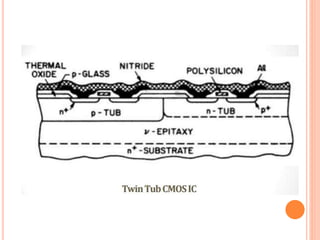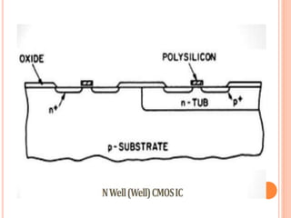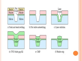 The document outlines various aspects of integrated circuit (IC) technology, focusing on VLSI process integration and device isolation methods, including LOCOS, trench isolation, and silicon-on-insulator (SOI) techniques. It covers the fundamentals of NMOS, CMOS, and bipolar technologies, detailing fabrication processes, advantages/disadvantages, and fault diagnosis techniques. Additionally, it emphasizes the importance of metallization and planarization in IC manufacturing.