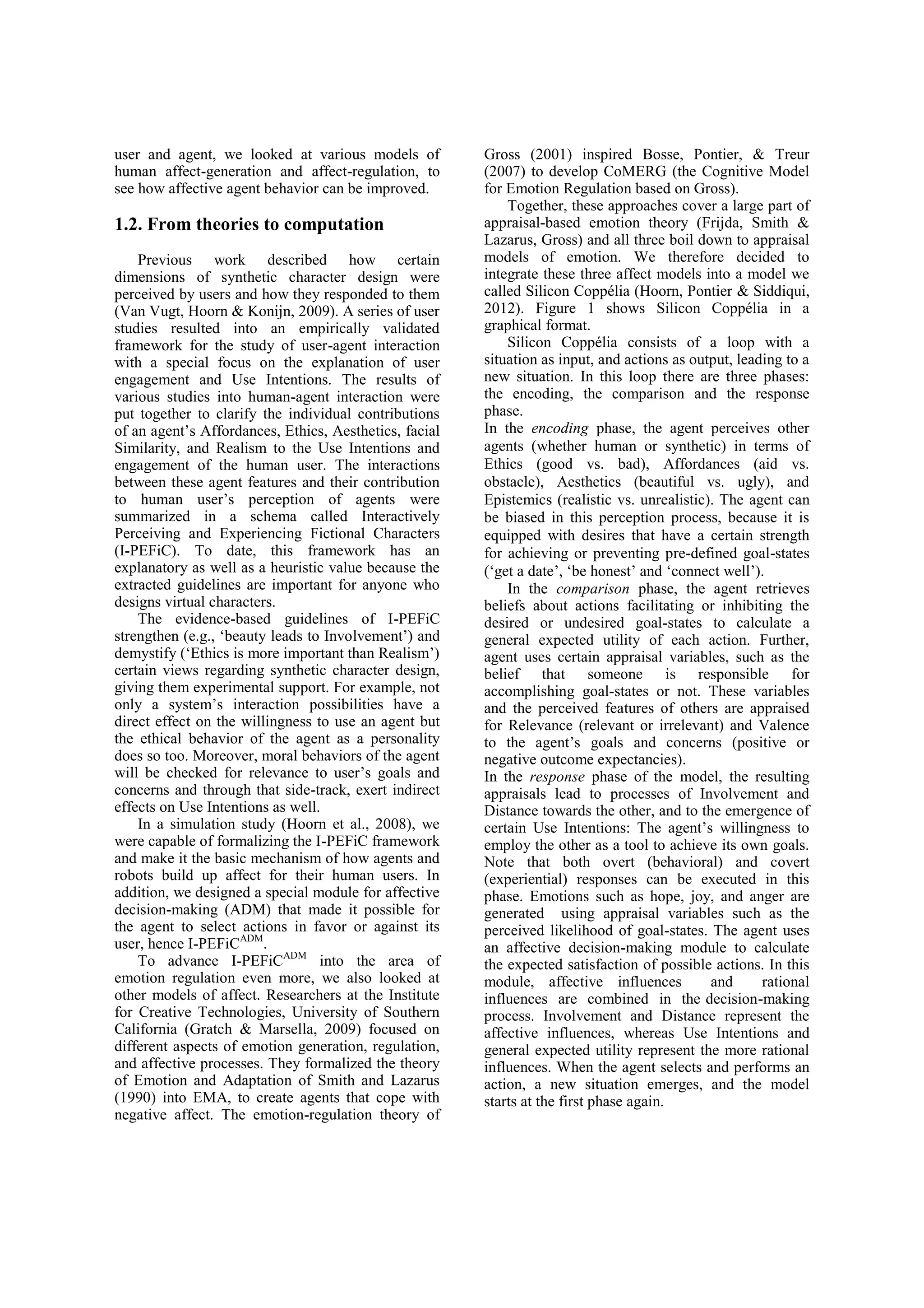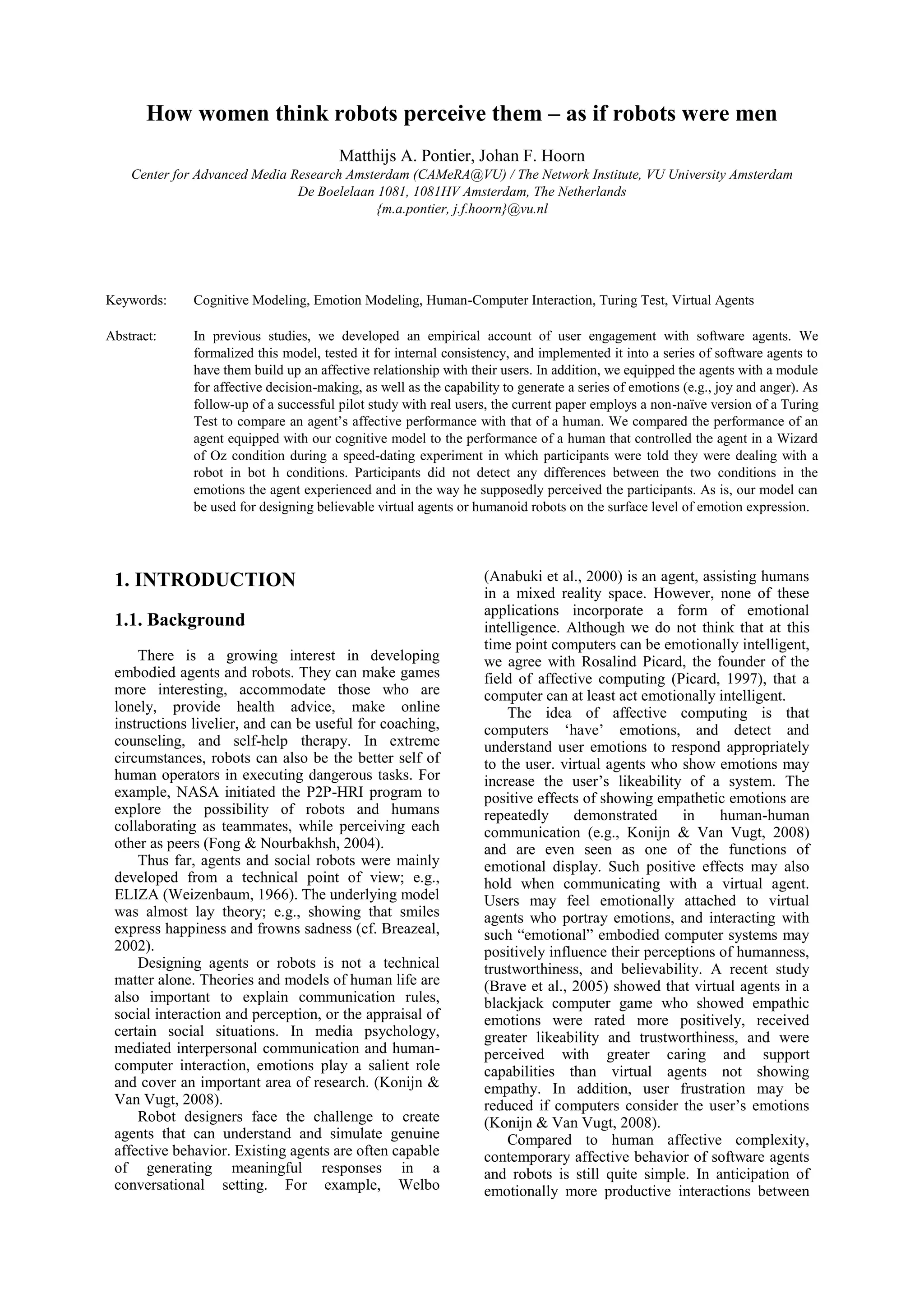 The document discusses the development and testing of a cognitive model for virtual agents, focusing on how these agents can simulate emotional interactions with users. It details a speed-dating experiment where a virtual agent named Tom interacted with participants to assess if users could discern human-like emotional responses between a machine and a human puppeteering a model. The findings suggest that participants did not detect significant differences in emotional behavior between Tom and the human controller, indicating potential for believable emotional expressions in AI systems.