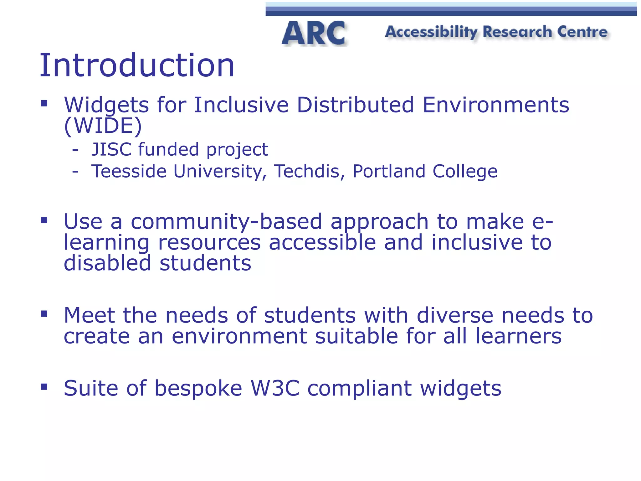 The document discusses the WIDE (Widgets for Inclusive Distributed Environments) project which aims to create widgets to make e-learning resources more accessible and inclusive for disabled students. The project uses a participatory design approach involving students and practitioners. Workshops were held to gather widget ideas which were developed using the Wookie platform. An evaluation found the widgets met expectations and highlighted a need for authoring tools to allow non-technical users to create widgets.
