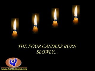 The four candles of Peace, Faith, and Love slowly burn out as their flames diminish, explaining that people no longer keep them lit or find them indispensable. A child enters and cries seeing the unlit candles. The fourth candle, Hope, says not to be afraid and that while it is still burning, it can re-light the other candles. The child takes the Candle of Hope and re-lights Peace, Faith, and Love. The message is that the flame of hope should never go out and that people can maintain hope, faith, peace, and love.