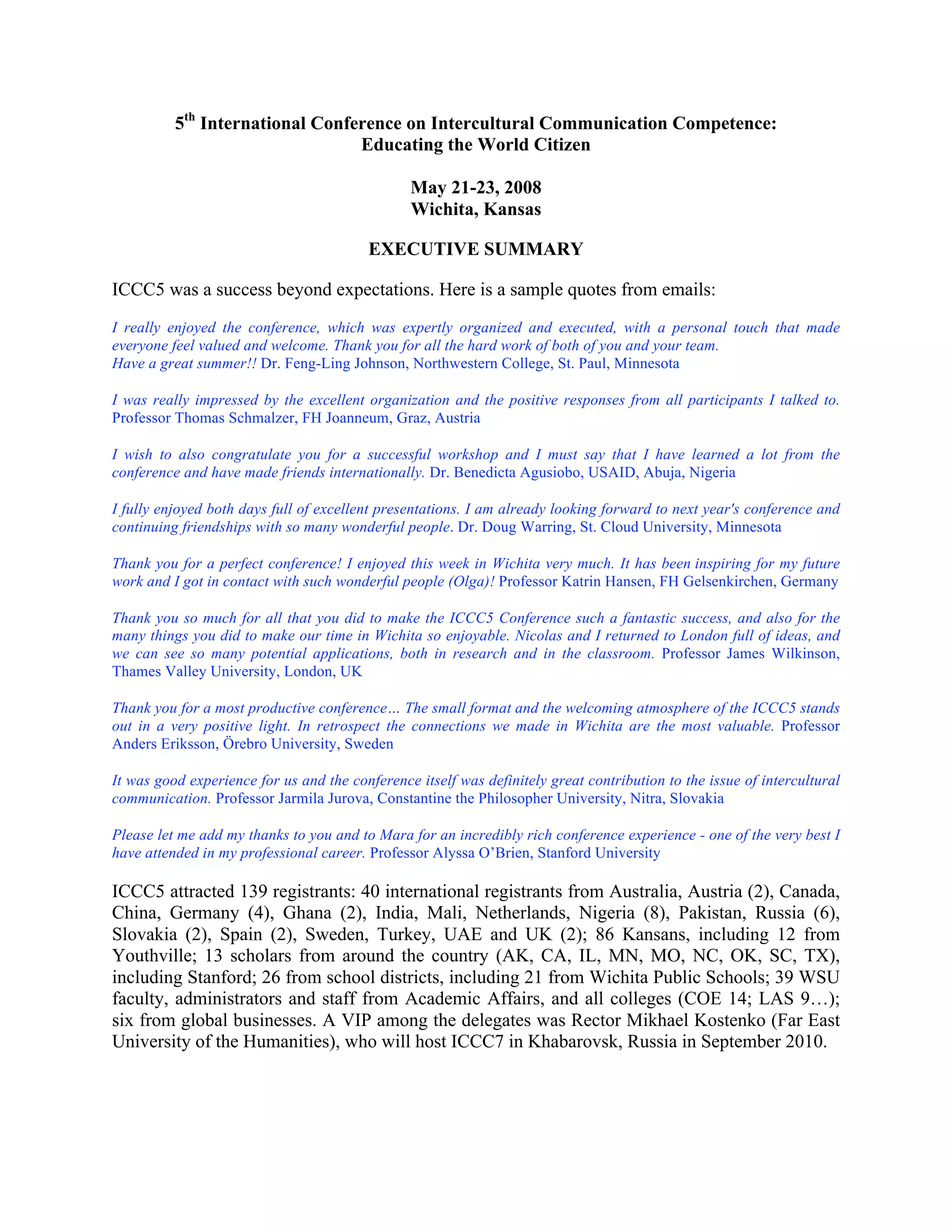The 5th International Conference on Intercultural Communication Competence was held in Wichita, Kansas from May 21-23, 2008. The conference was a great success with 139 attendees from over 15 countries and many US states. Participants found the conference to be very well organized and enjoyed the high quality presentations, workshops and opportunities to network. Many attendees expressed interest in future collaborations with Wichita State University faculty. The conference helped strengthen partnerships between the College of Education and local school districts. It also led to plans for future publications and international conferences on intercultural communication topics.