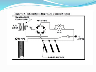 The document discusses impressed current cathodic protection systems which use an external DC power source to provide corrosion protection for large structures like pipelines and storage tanks. It describes the system components including anodes, cables, rectifiers and how they work together. Factors that influence design include current requirements, soil resistivity testing and anode placement. Graphs show representative resistance values for different anode types.