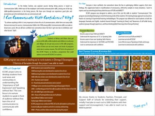 The document describes a program called ICCWC that aims to help rural students improve their communication skills and confidence. The program teaches students techniques to overcome fear, anxiety, and reticence when speaking in public or in groups. It uses experiential and hands-on learning methods. Over 8,000 students across 19 villages in Karnataka were trained through this free program. The training focused on self-awareness, gestures, posture, and expressing oneself without fear.