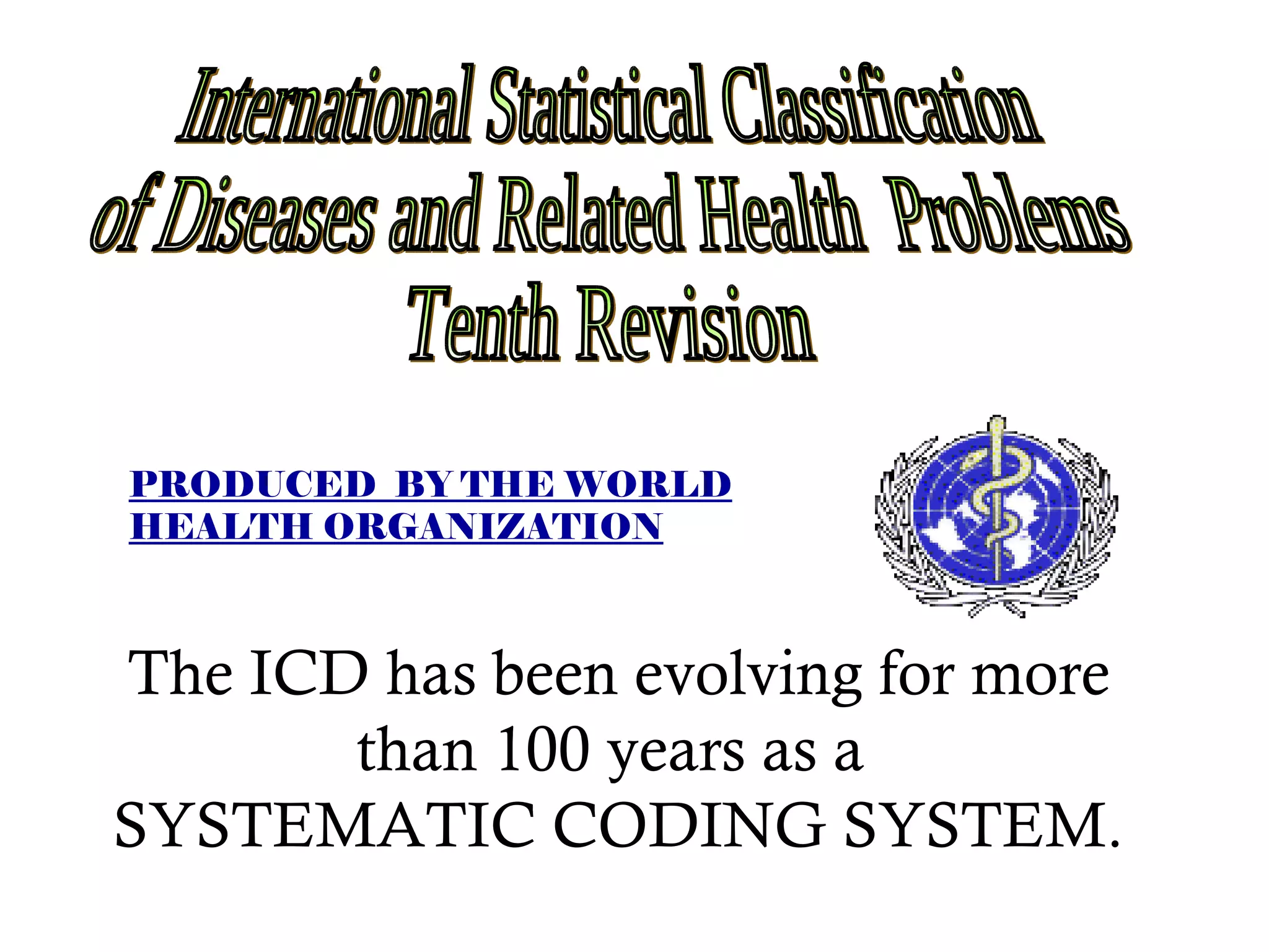 The ICD-10 is a systematic coding system developed by the World Health Organization for classifying diseases and health conditions into categories for statistical analysis and reporting, and it has been revised over 100 years. The ICD-10 code structure is alphanumeric and used internationally to classify morbidity and mortality data for purposes like epidemiology, health services planning, and medical care management. Proper use of ICD-10 codes allows for consistent and accurate health statistics to be produced and compared across hospitals, regions, and countries.