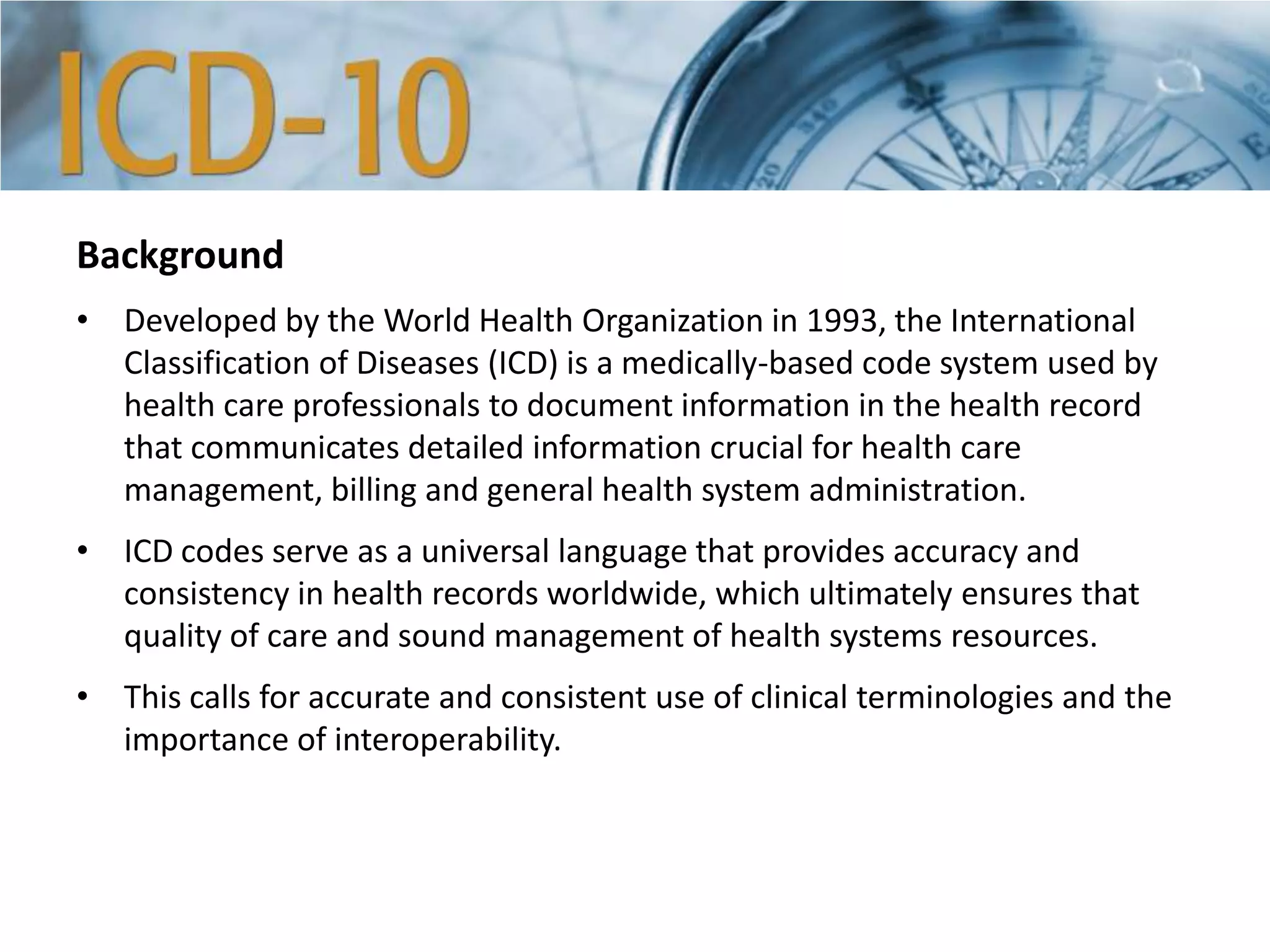 The International Classification of Diseases (ICD), developed by the World Health Organization, aims to provide a uniform language for healthcare documentation. The U.S. transition from ICD-9 to the more detailed ICD-10 is mandated for all HIPAA-covered entities by October 1, 2015, emphasizing the need for training, operational changes, and proper coding to ensure reimbursement. Successful implementation involves careful planning, communication, assessment, and adequate training for all staff to adapt to the complexities of the new coding system.