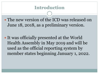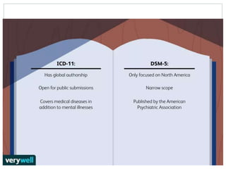 The document provides an overview of changes between the ICD-10 and ICD-11 classification systems for mental disorders. Some key changes include combining pervasive developmental disorders into autism spectrum disorder, removing schizophrenia subtypes, adding catatonia as a standalone diagnosis, and reorganizing anxiety and obsessive-compulsive disorders. The ICD-11 also aims to improve international applicability and be more digitally compatible. Overall, the document outlines many revisions to the ICD classification of mental disorders based on the latest evidence and alignment with the DSM-5 system.
