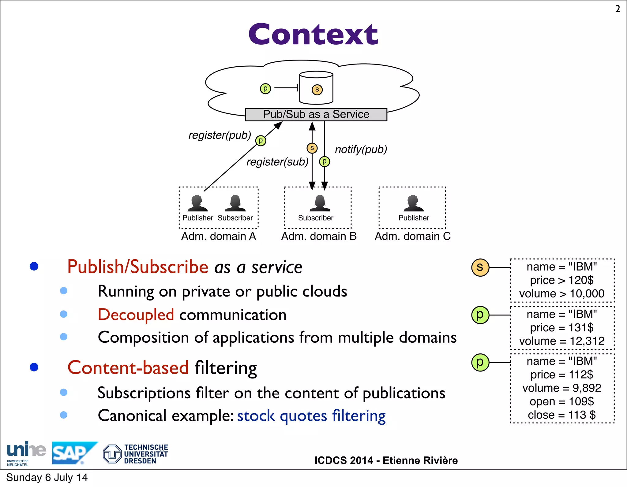 The document discusses the elastic scaling of a high-throughput content-based publish/subscribe engine named Streamhub, focusing on its architecture, scalability requirements, and resource provisioning. It highlights the capability to dynamically adjust resources based on load through efficient slice migration and elasticity policies, ensuring service continuity while handling high volumes of subscriptions and notifications. The evaluation involves performance assessments using real-world workloads, demonstrating the engine's effectiveness in cloud environments.