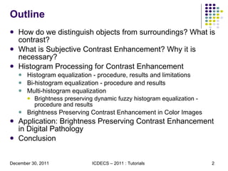 The document discusses techniques for contrast enhancement of digital images through histogram processing. It describes histogram equalization, which increases contrast by spreading out the most frequent intensity values. Limitations include changes to image brightness. Bi-histogram and multi-histogram equalization partition histograms to minimize brightness changes. Brightness preserving dynamic fuzzy histogram equalization further improves brightness preservation through fuzzy histogram computation, dynamic equalization of histogram partitions, and normalization of image brightness. It provides objective metrics to evaluate contrast enhancement and brightness preservation capabilities of these techniques.