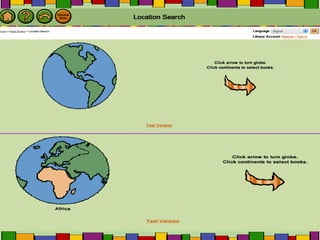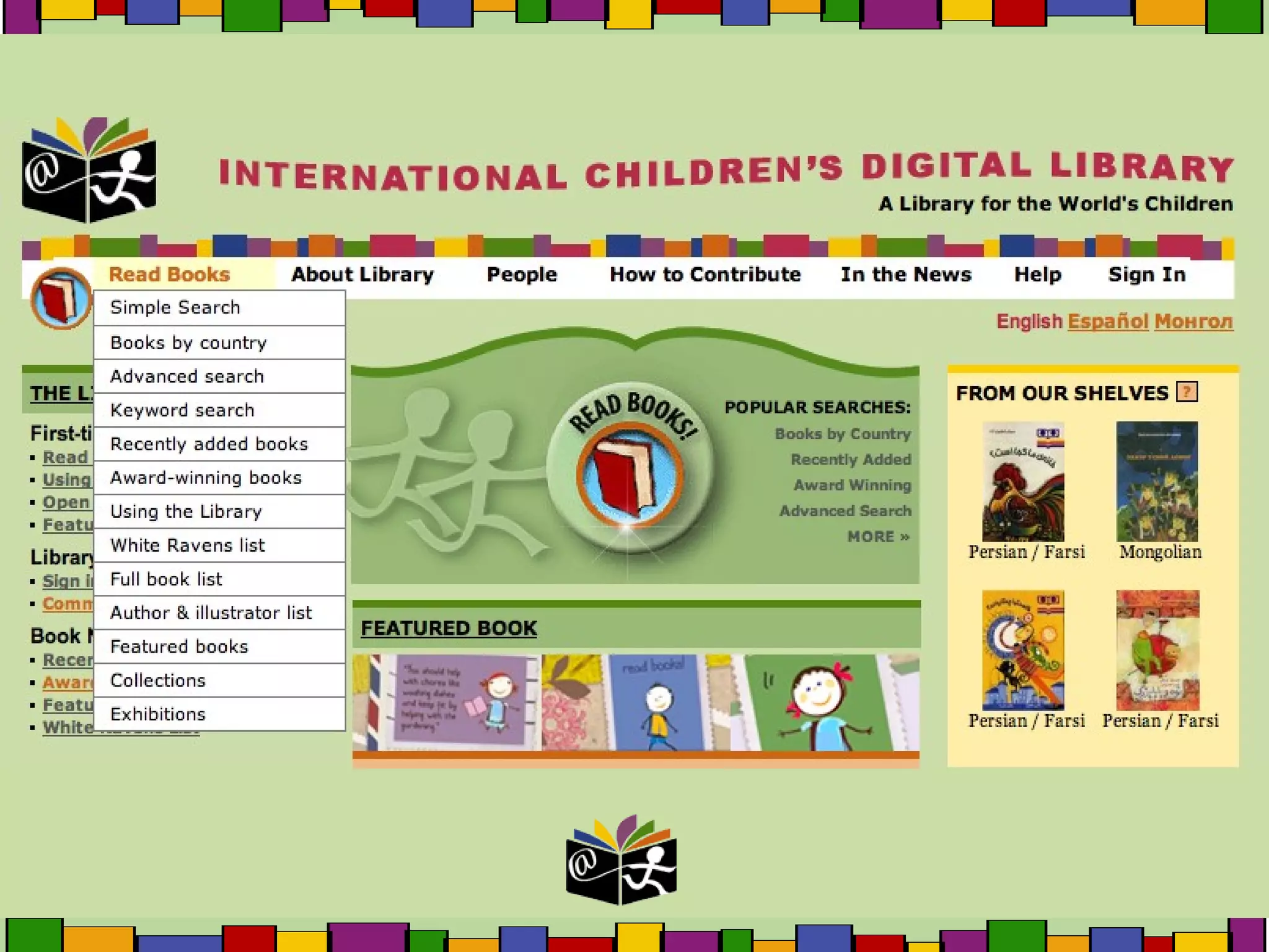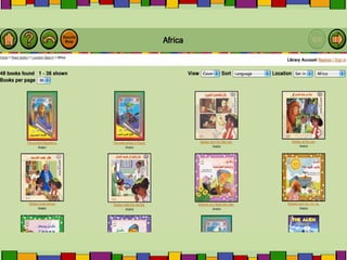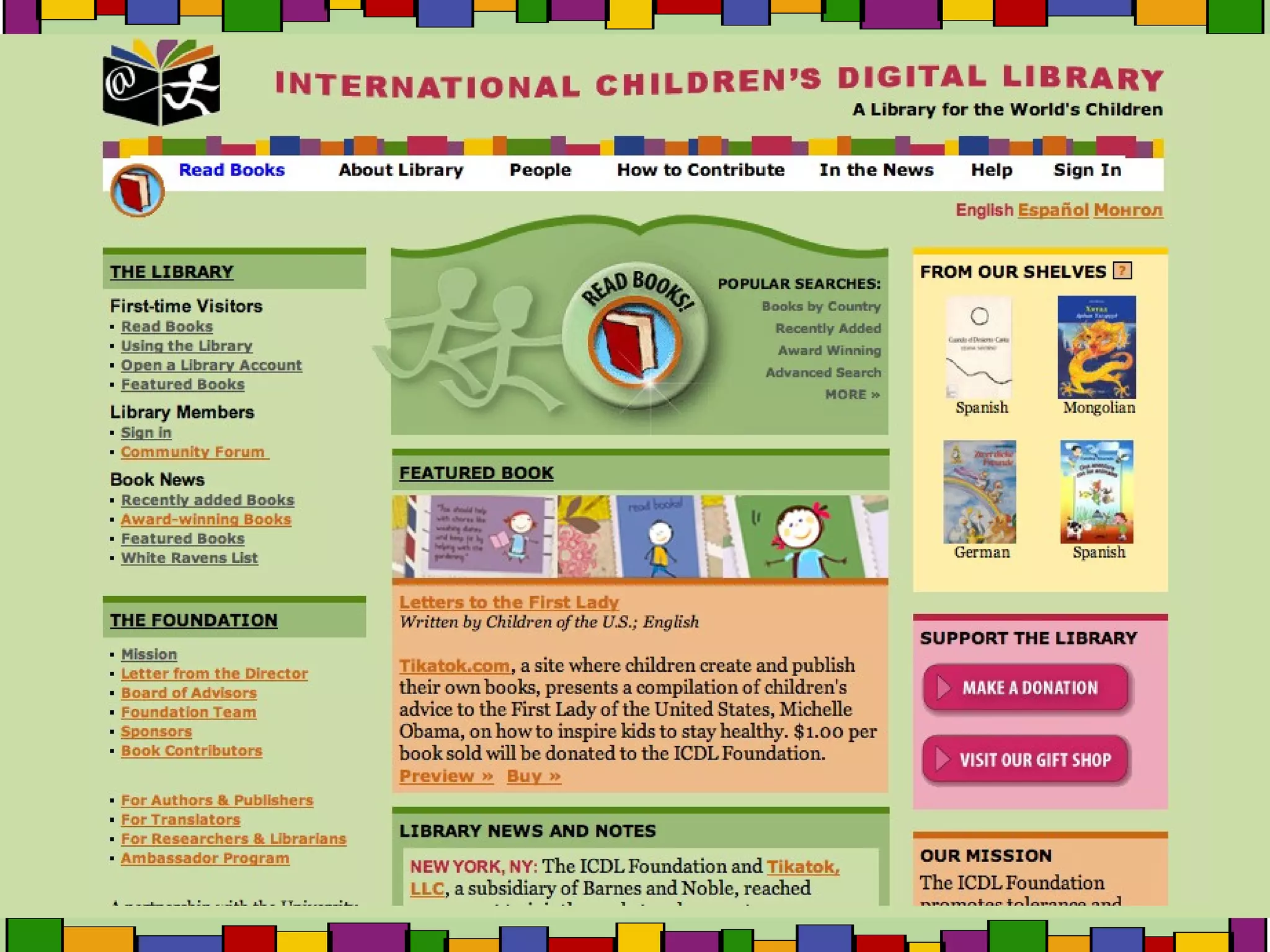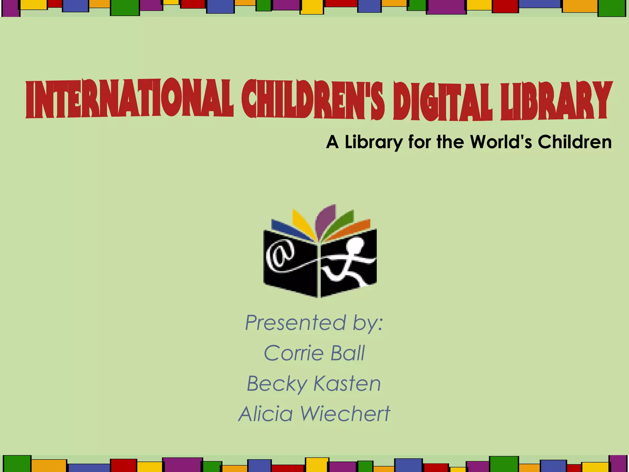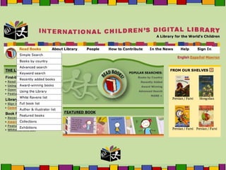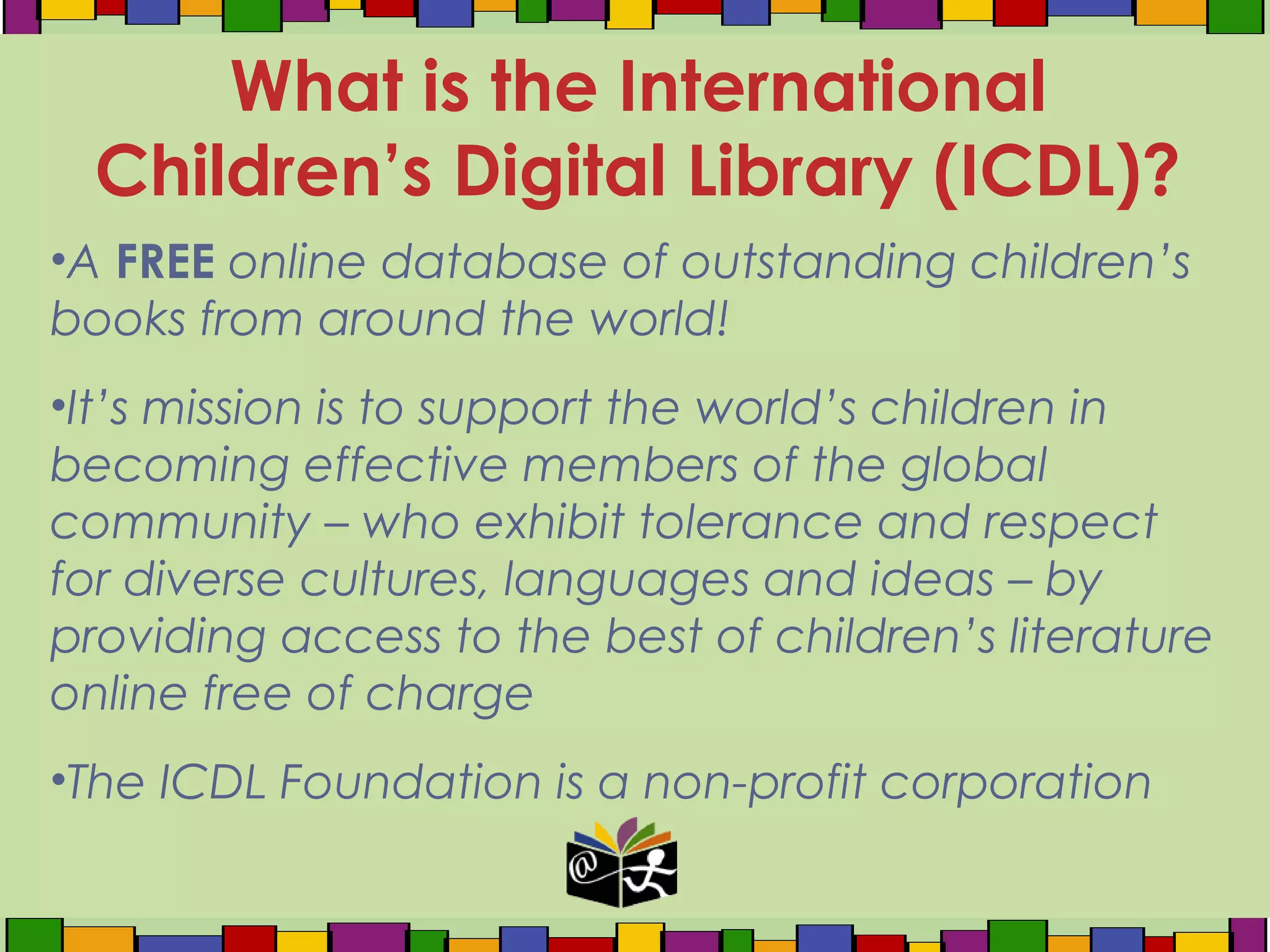 The International Children's Digital Library (ICDL) is a free online collection of children's books from around the world. It aims to promote cultural understanding among children by providing access to high-quality, diverse literature. The ICDL was created in 2002 by researchers at the University of Maryland. It currently features over 4,000 books in 54 languages. The ICDL is intended for children ages 3-13, as well as educators and parents. It offers various ways to search for and view books. The ICDL has had over 3 million visitors and is used in classrooms worldwide to teach topics like language arts, social studies, and foreign culture.