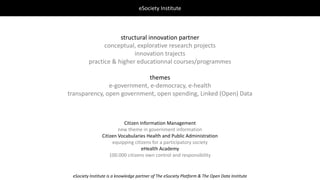 The eSociety Institute conducts conceptual, exploratory research projects and innovation trajectories to develop a strategy for a national digital society using an integral approach to equip digital citizens. The institute partners with various government organizations, research platforms, and educational institutions. Key research areas include e-government, e-health, open data, and citizen information management to support an active, participatory digital society.