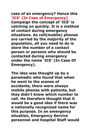 Paramedics started the "ICE" (In Case of Emergency) campaign to address not knowing who to contact when coming across cell phones at accident scenes. The idea is to store the name of an emergency contact under the label "ICE" in your phone so emergency services can easily find and call that person. This allows them to quickly notify those close to you what has happened. Many people now list emergency contacts as ICE1, ICE2, etc. for multiple numbers to ensure the right contact is reached during crises when the phone's owner cannot communicate themselves.