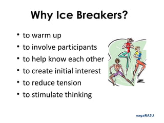 This document discusses ice breakers, which are activities used at the beginning of meetings or trainings to help participants get to know each other and feel more comfortable. It lists the main reasons for using ice breakers as warming up participants, getting them involved, and helping reduce tension. The document also provides tips for effective ice breakers such as relating them to the topic, clearly instructing participants, keeping things simple and fun, and nurturing thinking. A caution is given that using too many ice breakers can be as ineffective as using no ice breakers at all.