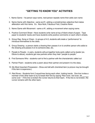 The document appears to be a worksheet for an icebreaker activity called "Getting to Know You." It contains 20 prompts for students to find other students who fit certain descriptions and have them sign their sheet. The prompts cover topics like shared initials, place of birth, hobbies, favorite subjects, and other personal details. The goal is for students to collect as many signatures as possible to learn more about their classmates.