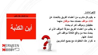 المستند يتناول نشاطات تدريبية لإزالة الخوف والحواجز بين المتدربين من خلال عدة ألعاب يتفاعلون فيها مع بعضهم. تشمل الأنشطة إعداد مواقف حقيقية ولعبة تكملة القصة، حيث يهدف كل نشاط إلى تعزيز المهارات الاجتماعية والتواصل بين الأعضاء. الهدف الأساسي هو تحسين الجرأة والقدرة على التعبير عن الرأي وتطوير التعاون والمسؤولية ضمن المجموعة.
