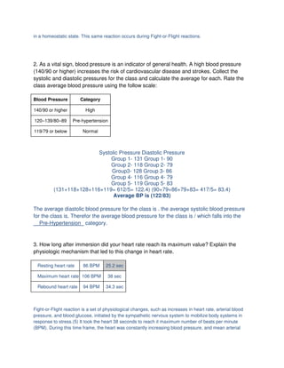 1. The data tables show the subject's baseline blood pressure and heart rate measurements, as well as measurements taken after exercising. Systolic, diastolic, and mean arterial pressures all increased after exercise, as did heart rate.