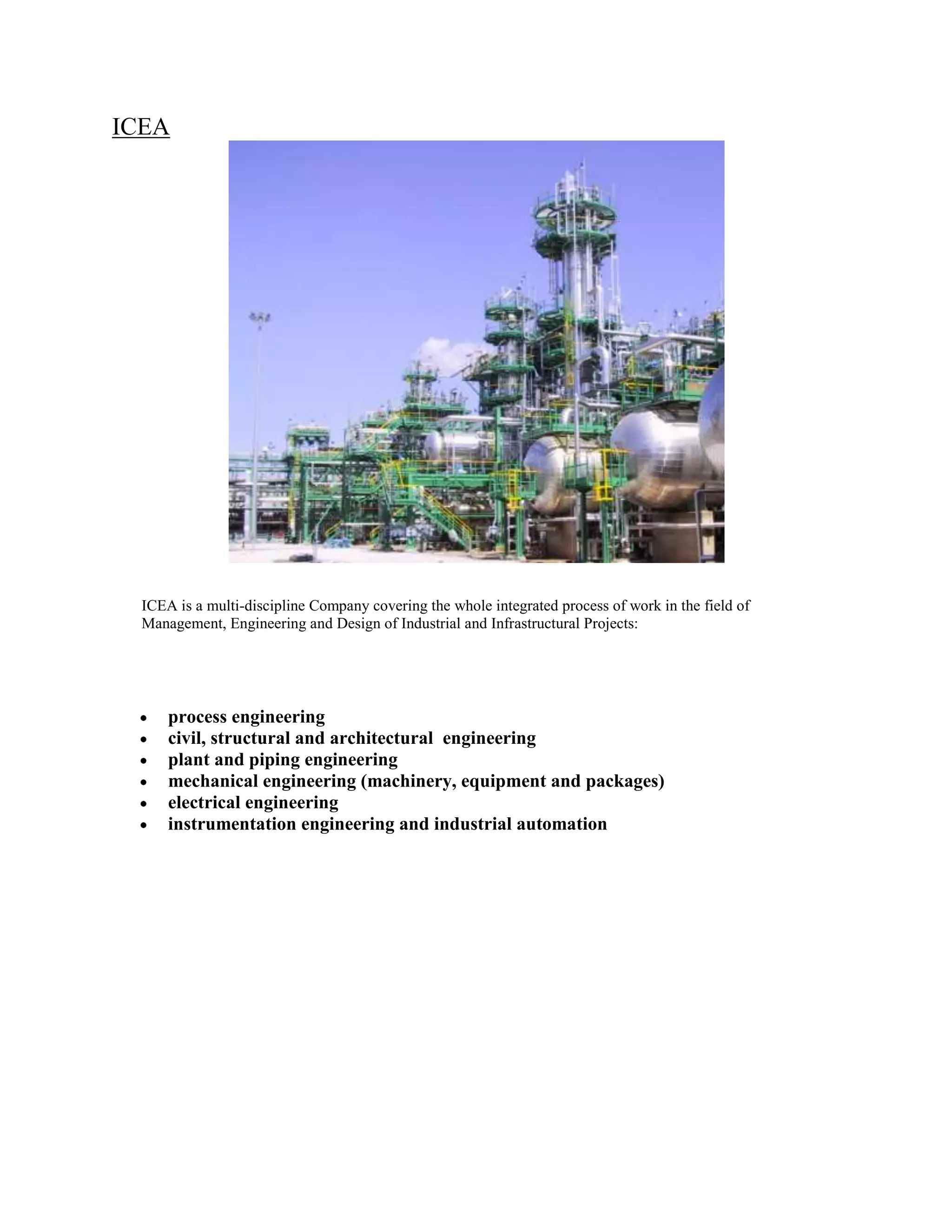 ICEA is a multidisciplinary engineering company providing services across various fields including process engineering, civil works, plant design, mechanical engineering, electrical engineering, and more. They have over 120 staff members with extensive experience working on projects in industries like chemical, petrochemical, energy, water treatment, and pharmaceuticals. ICEA offers a full range of engineering services from design to commissioning and start-up, with the goal of saving customers money and optimizing their resources.