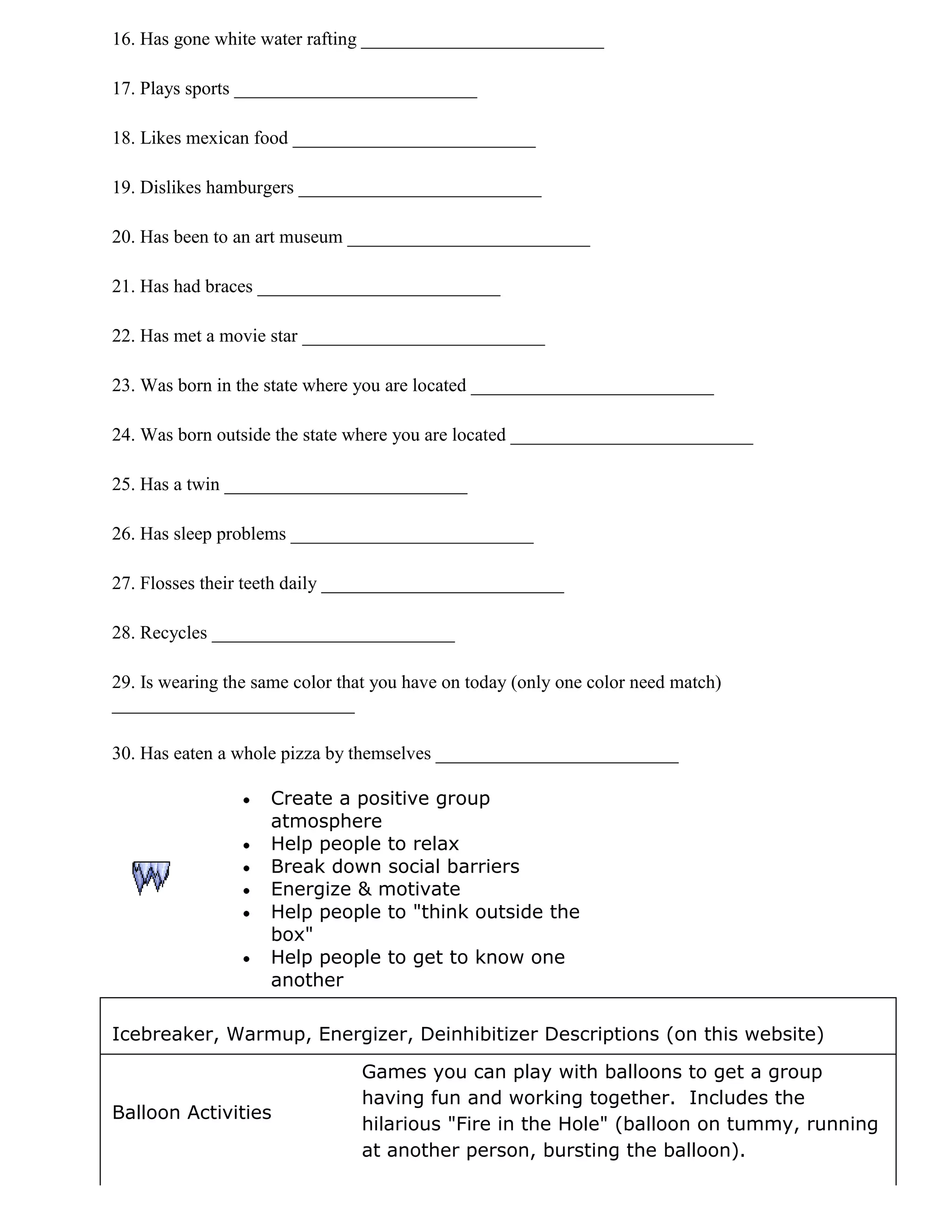 The document describes an icebreaker activity called "Scavenger Hunt" where participants find other group members who match different criteria like birth month or hobbies. The criteria are listed as questions 1-30. The goal is to get participants interacting and learning about each other. Additional pages provide descriptions and instructions for implementing other team-building exercises like trust falls, human knots, and energizers using movement and physical interaction.