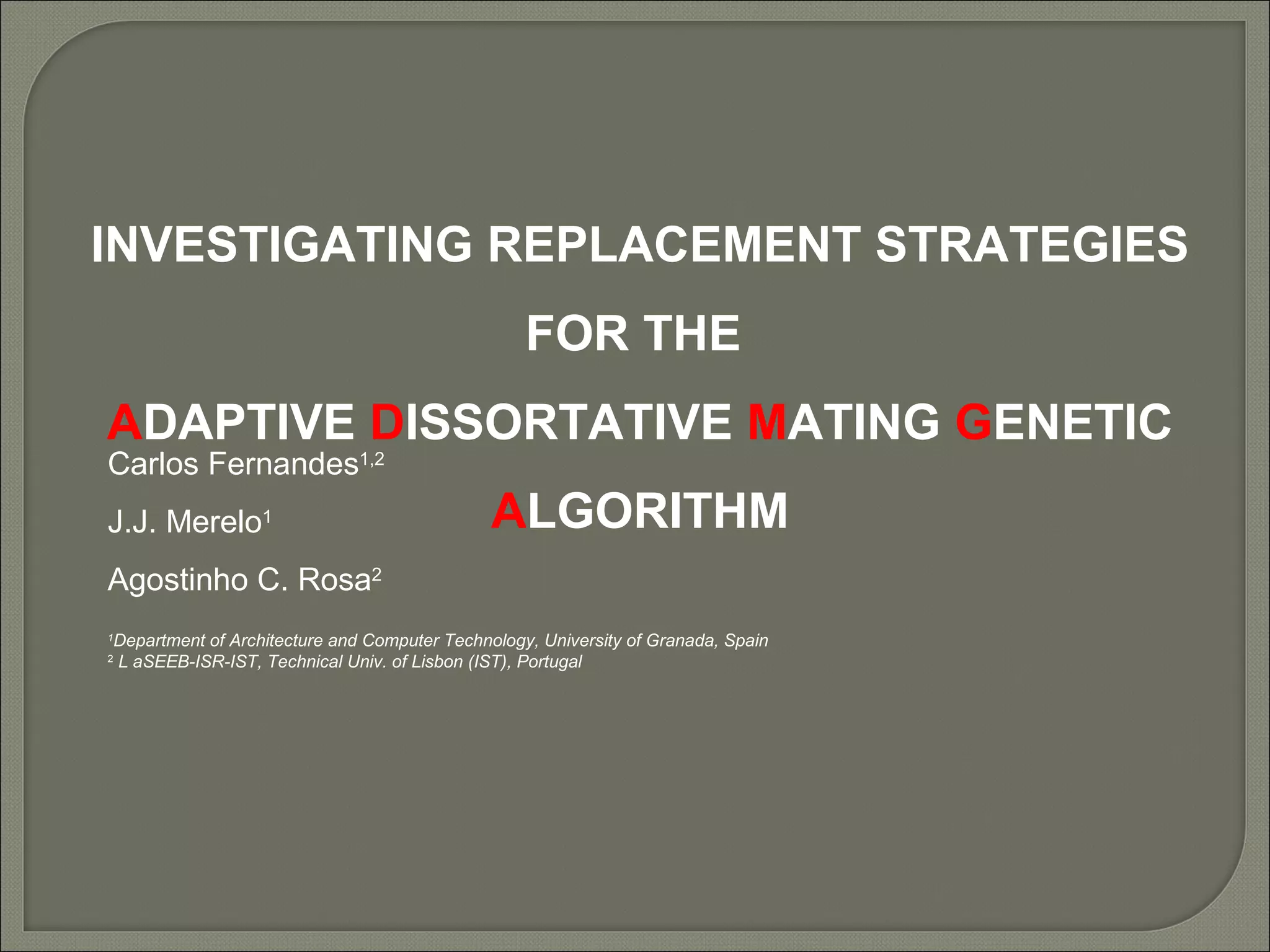 This document investigates replacement strategies for the Adaptive Dissortative Mating Genetic Algorithm (ADMGA) to improve its performance on dynamic optimization problems where the optimal solution changes over time. It compares the original ADMGA replacement strategy of selecting offspring and best parents to strategies that incorporate mutated copies of old solutions or the best solution. Testing on benchmark problems with different rates of change shows strategies using mutated old solutions outperform the standard genetic algorithm and are competitive with the estimation of distribution algorithm on faster changing problems.