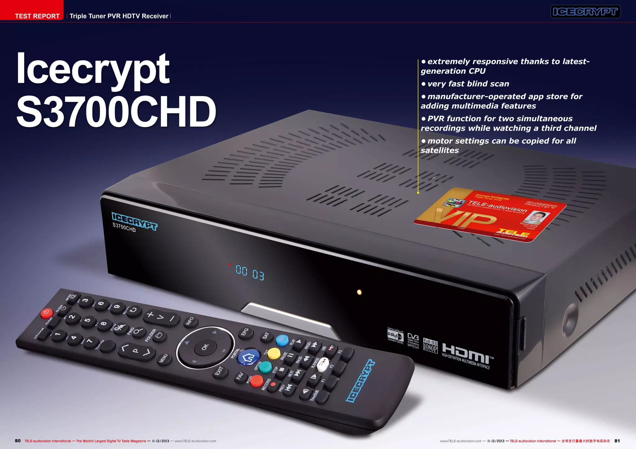 The document provides a test report of the Icecrypt S3700CHD triple tuner PVR HDTV receiver. It has an elegant front panel with a readable display and smartcard readers. The back panel has three tuner inputs, various audio/video outputs, and a network interface. The remote is comfortable and labels are clear. Setup includes language selection, network setup, and video resolution selection. A blind scan found more channels than a standard search. The software allows copying motor settings between satellites and has a user-friendly channel list and settings menu. It also has a variety of multimedia and smart TV apps. In summary, the receiver has excellent hardware and sophisticated but easy-to-use software.