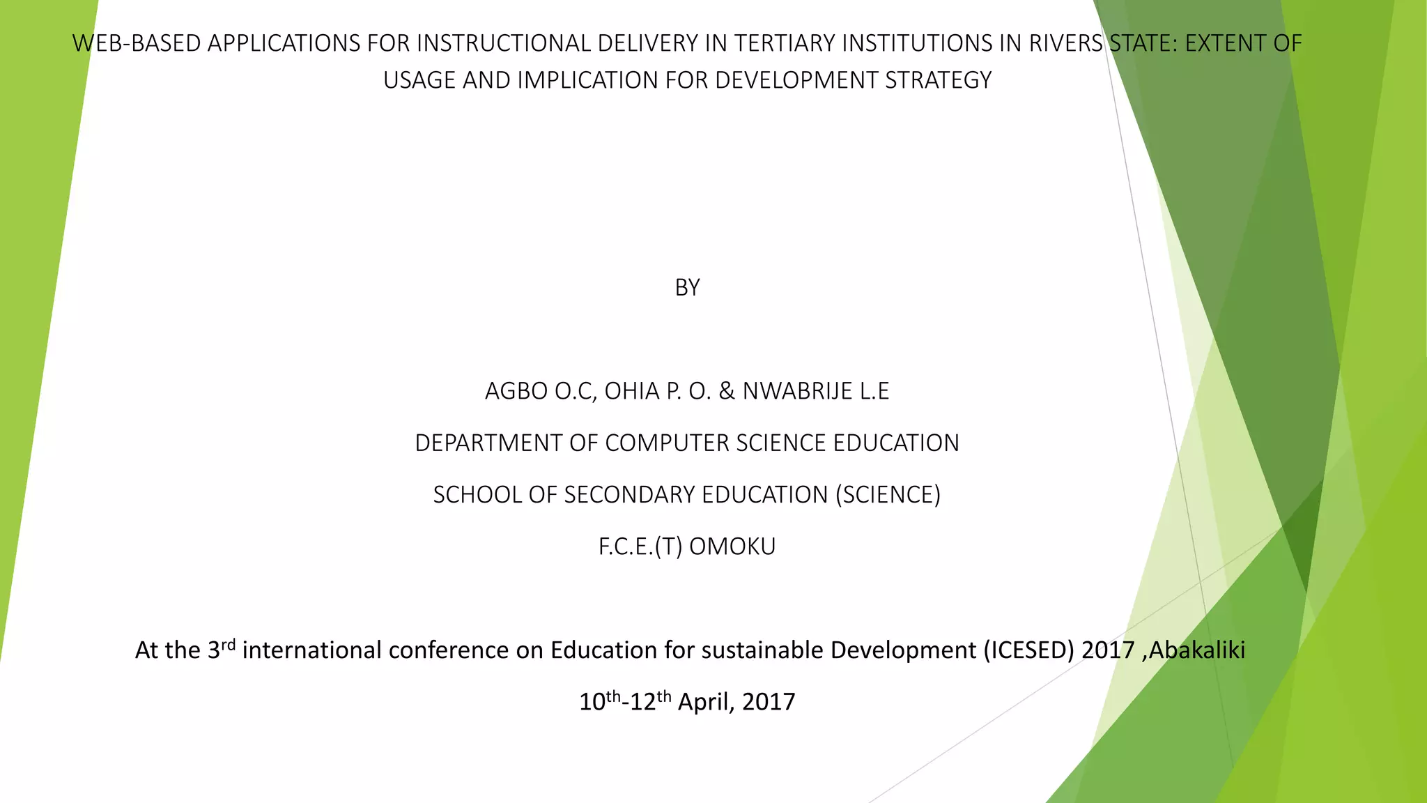 The study investigated the extent of usage of web-based applications (WBA) for instructional delivery by lecturers in tertiary institutions in Rivers State, revealing that both male and female lecturers reported low usage of both restricted and non-restricted access applications. The research employed a descriptive survey design with a sample of 140 lecturers, analyzing data through mean, standard deviation, and t-tests, concluding no significant gender differences in usage. Recommendations include enhancing access to WBA, training lecturers on effective use, and improving infrastructure for technology integration in education.
