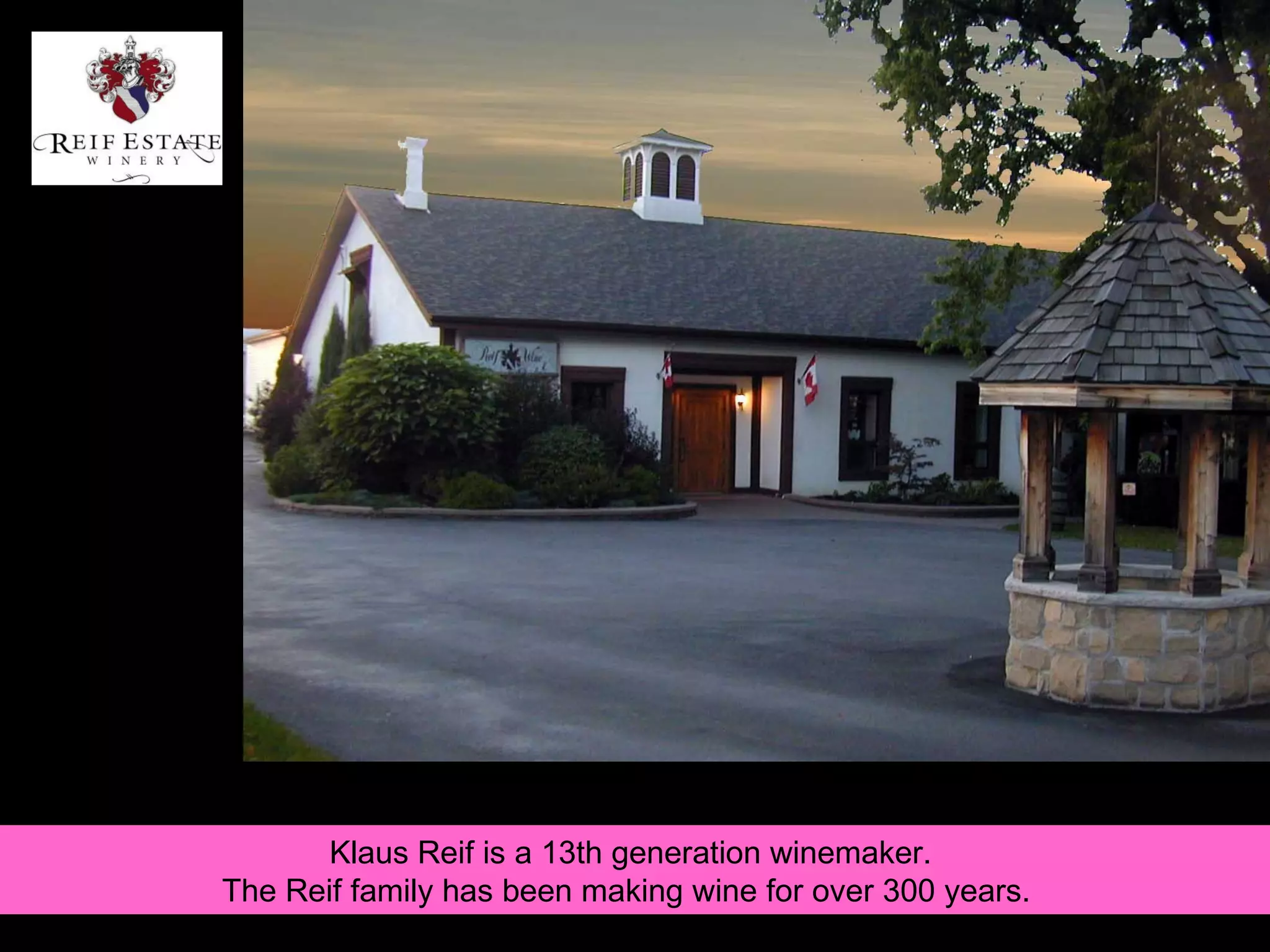Klaus Reif is a 13th generation winemaker from the Reif family, who have been making wine for over 300 years. He is unique as the only winemaker who produces Icewine on two continents. The Niagara Escarpment below Niagara Falls creates ideal conditions for cold weather grape growing and winemaking. Reif Estate Winery produces traditional and Icewine varieties using time-honored methods of leaving grapes on the vine until freezing temperatures allow for extraction of richer, sweeter juices compared to regular wines.