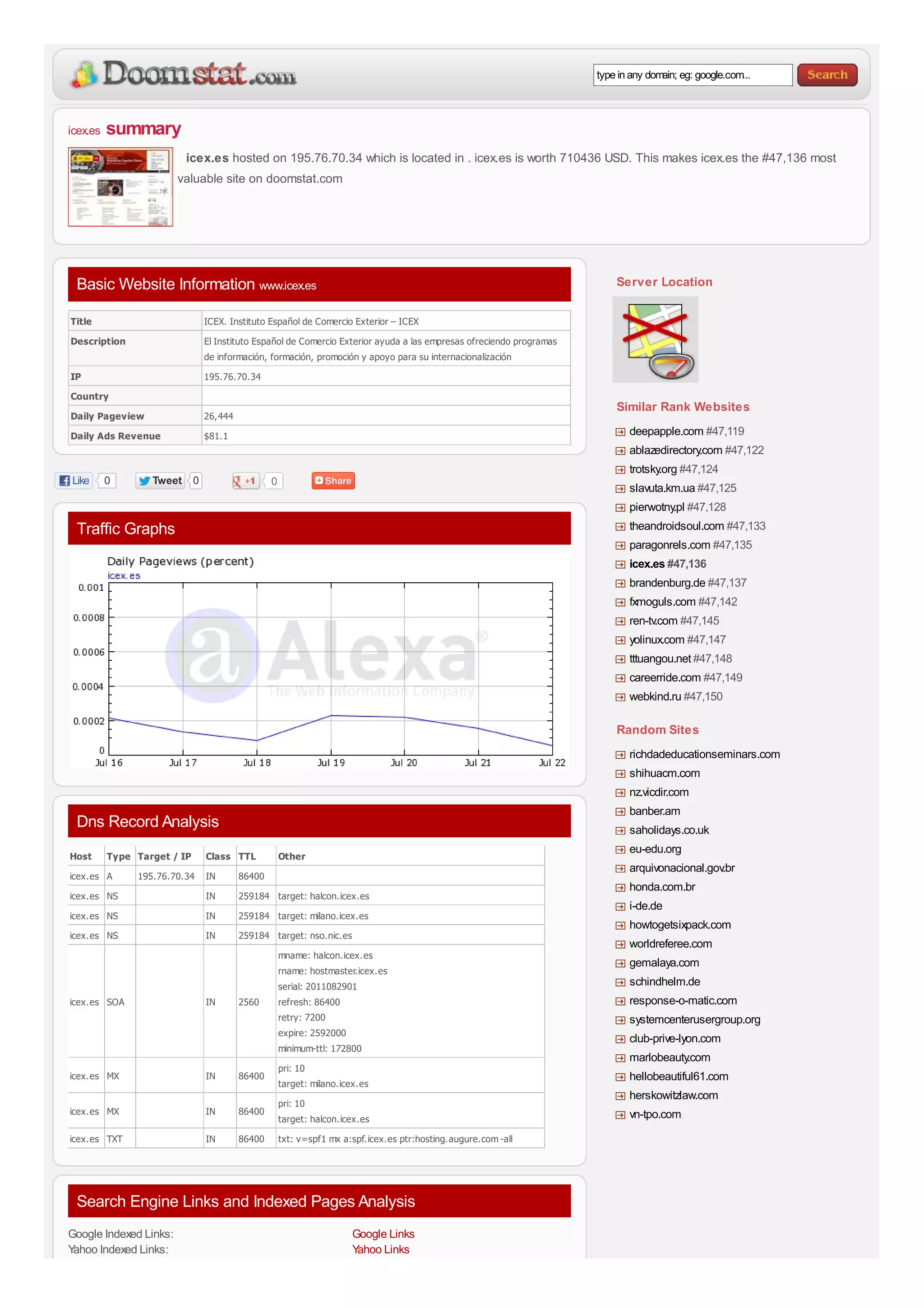 The document provides information about the website icex.es. It is hosted at the IP address 195.76.70.34 located in Spain. According to the website doomstat.com, icex.es is worth $71,436 USD, ranking it the #47,136 most valuable site. The website is for the Spanish government organization Instituto Español de Comercio Exterior, which helps Spanish companies with international trade.