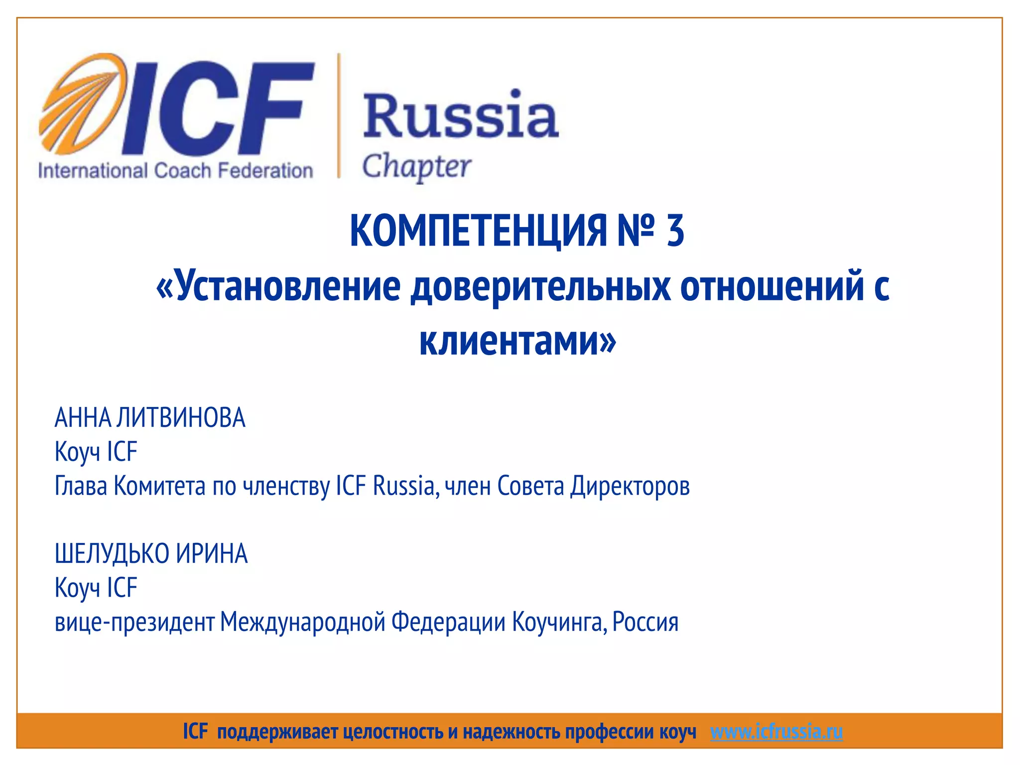 ICF поддерживает целостность и надежность профессии коуч, сосредоточив внимание на установлении доверительных отношений с клиентами. Основные правила включают заботу о благополучии клиента, демонстрацию честности и ясного общения, а также поддержку новых моделей поведения. Результат коучинга обеспечивает клиентам чувство принятия, уверенности и понимания.
