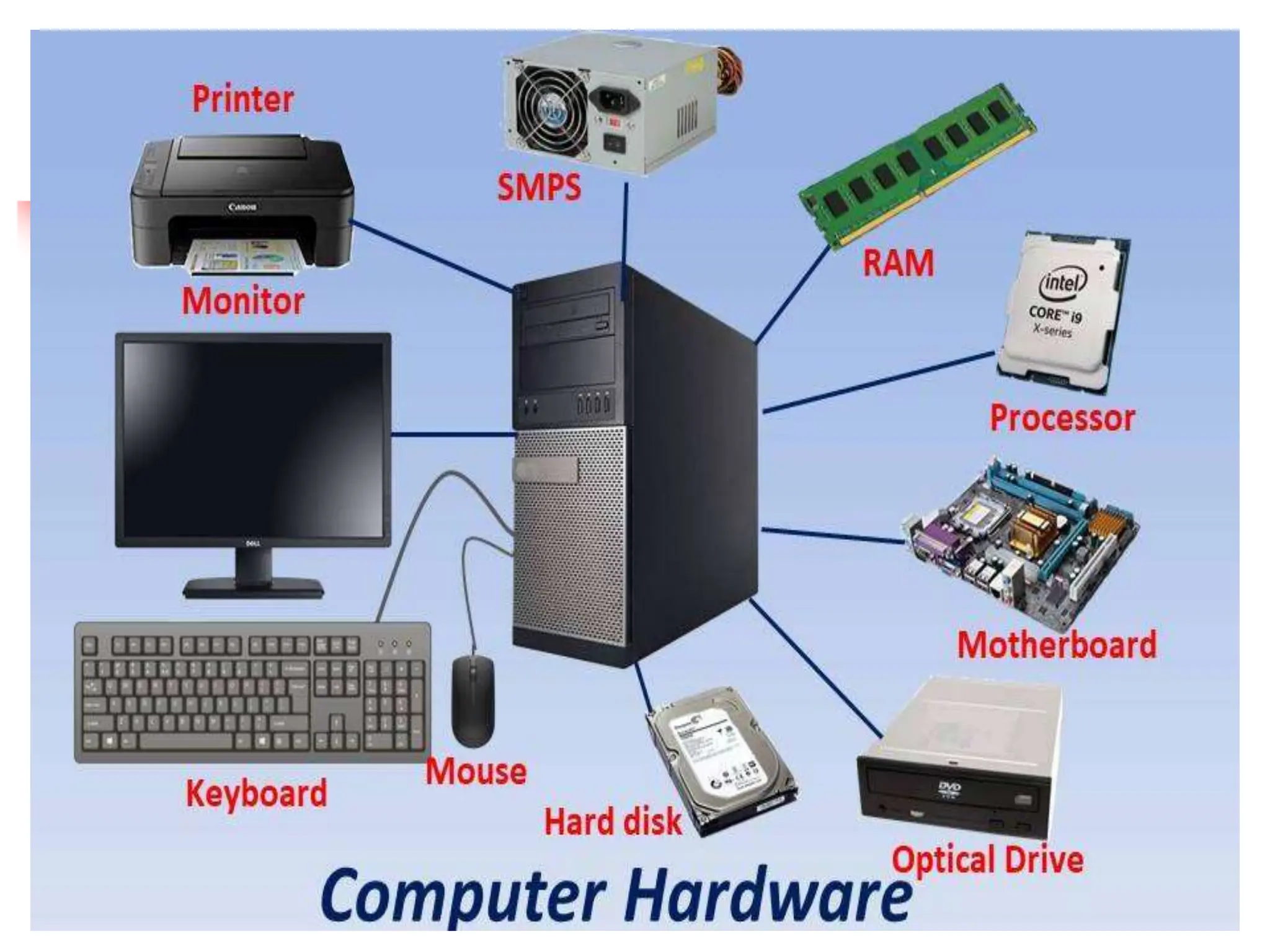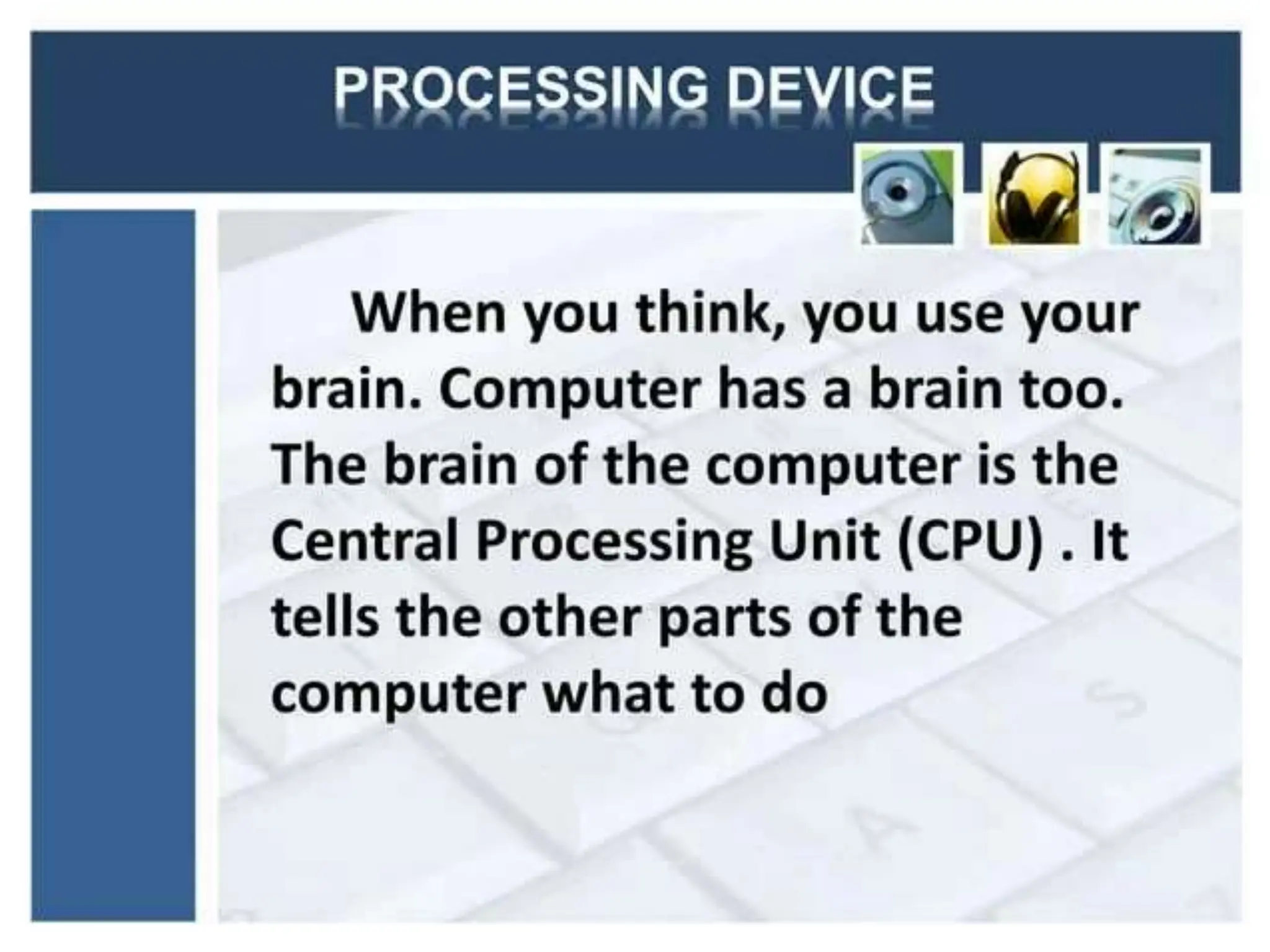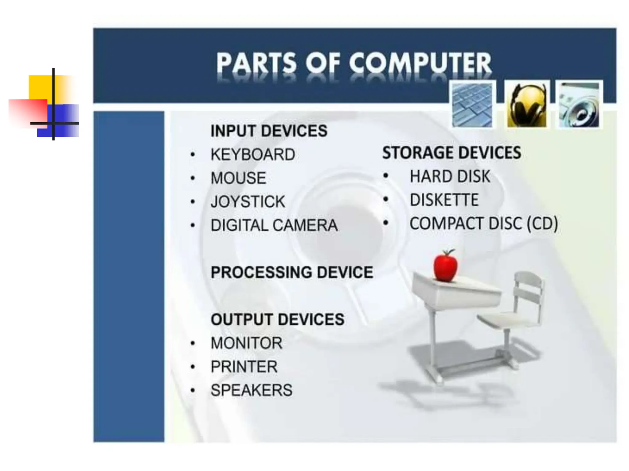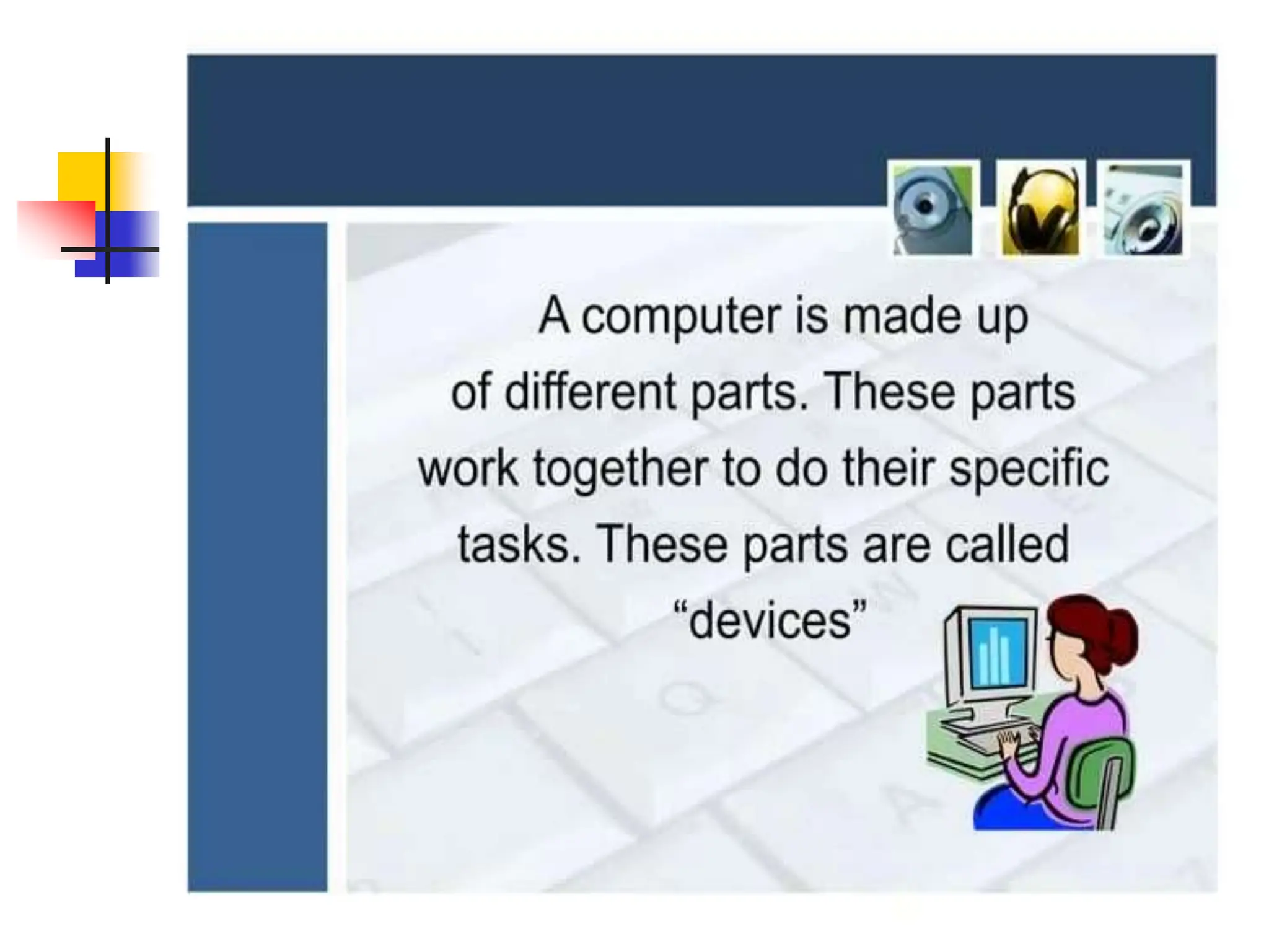 The document discusses the key elements of a computer system, including hardware, software, peopleware, and data. It provides details on common computer parts like the system unit, motherboard, CPU, memory, ports, storage devices, input devices, output devices, and communication devices. It also defines software, operating systems, and gives examples of MS-DOS and Windows. The overall topic is the components that make up a basic computer system.
