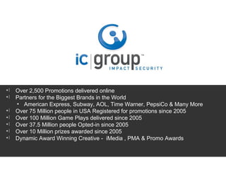 iC Group is an expert in online promotional marketing, having delivered over 2,500 promotions for major brands. They have a track record of over 75 million registrations and 100 million game plays delivered. Their services include developing creative concepts, online media strategies, and providing a full suite of promotional tools and technologies to engage consumers. They take an integrated approach to promotions across online, mobile, social media, and other channels to maximize participation and drive business objectives.