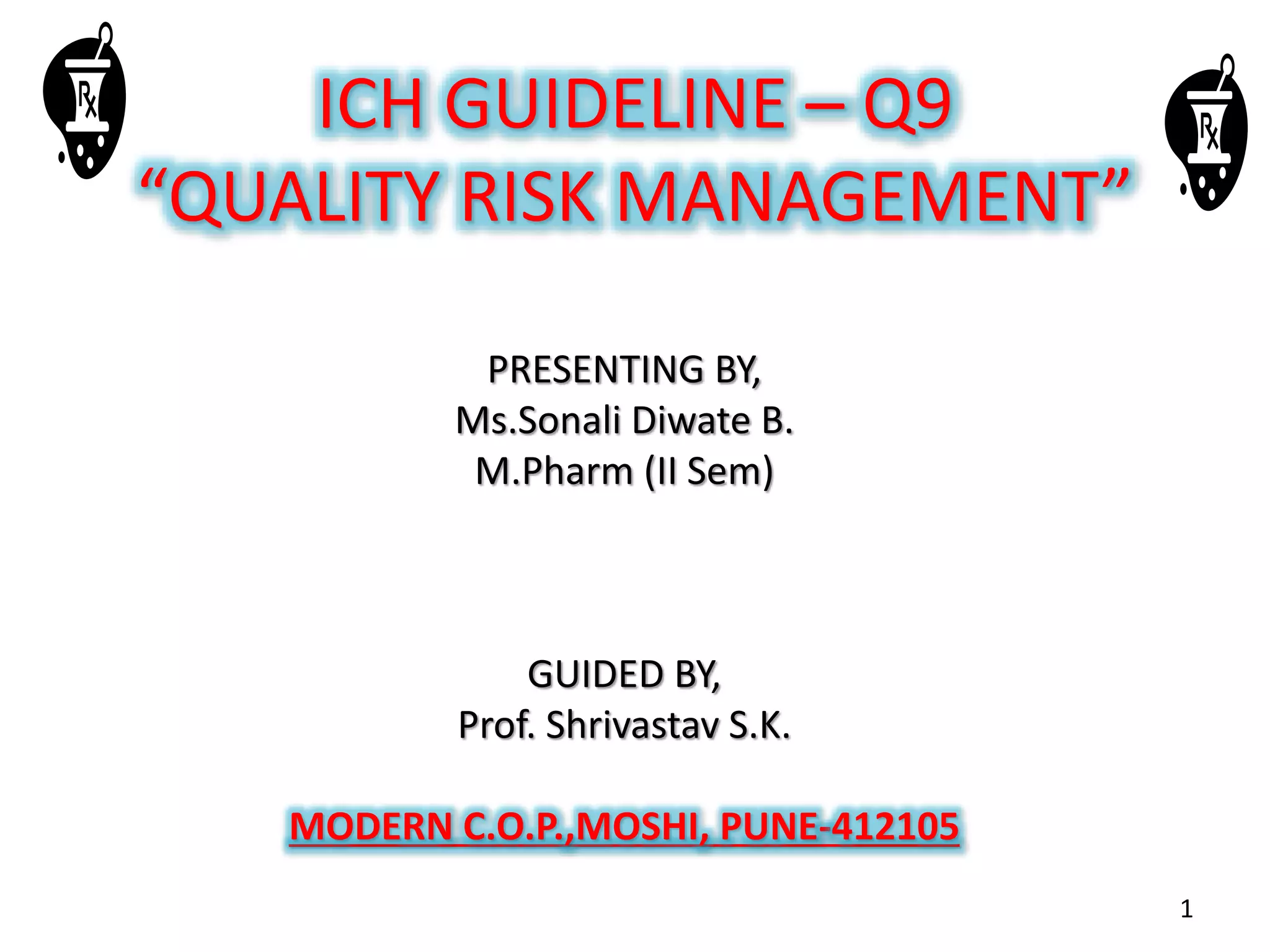 This document summarizes a presentation on ICH Guideline Q9 on quality risk management. The objectives are to understand the concept of quality risk management, risk, and ICH Q9's role in new drug development. It discusses quality risk management as a systematic process to assess, control, communicate and review risks to drug quality across the product lifecycle. ICH Q9 provides principles and tools for quality risk management that can be applied at various stages including development, manufacturing, and distribution. It emphasizes linking quality risk management activities to protecting patient safety.