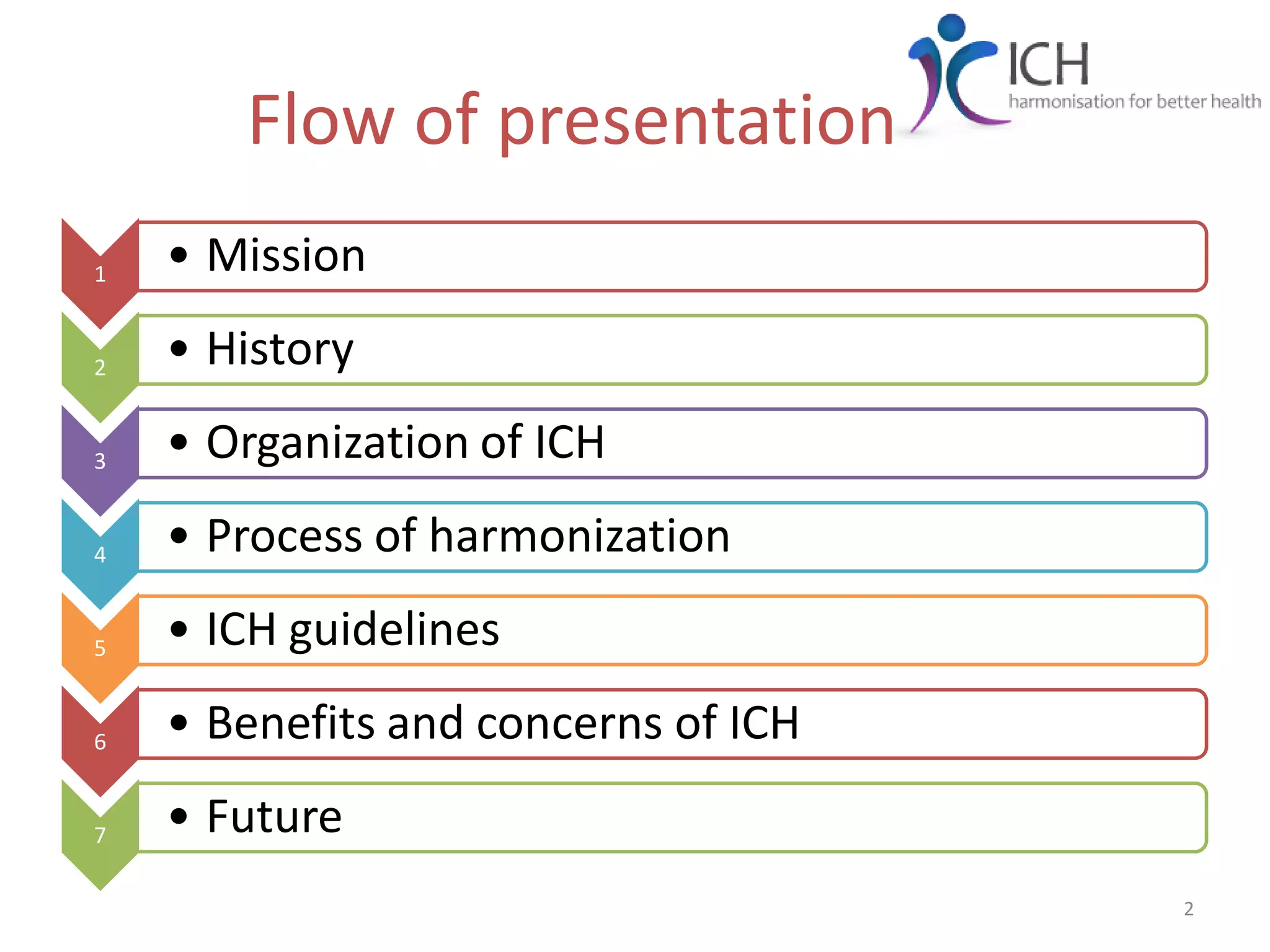 The International Conference on Harmonisation (ICH) was created in 1990 as a unique effort between regulators and industry from the EU, Japan, and US to harmonize technical requirements for pharmaceutical registration. ICH aims to ensure safety, efficacy, and quality of medicines while preventing duplicative trials and minimizing animal testing. Through guidelines developed via consensus building among members, ICH has harmonized requirements for drug development and approval processes. However, some concerns remain regarding inclusion of non-members in the decision making and implications for developing countries.