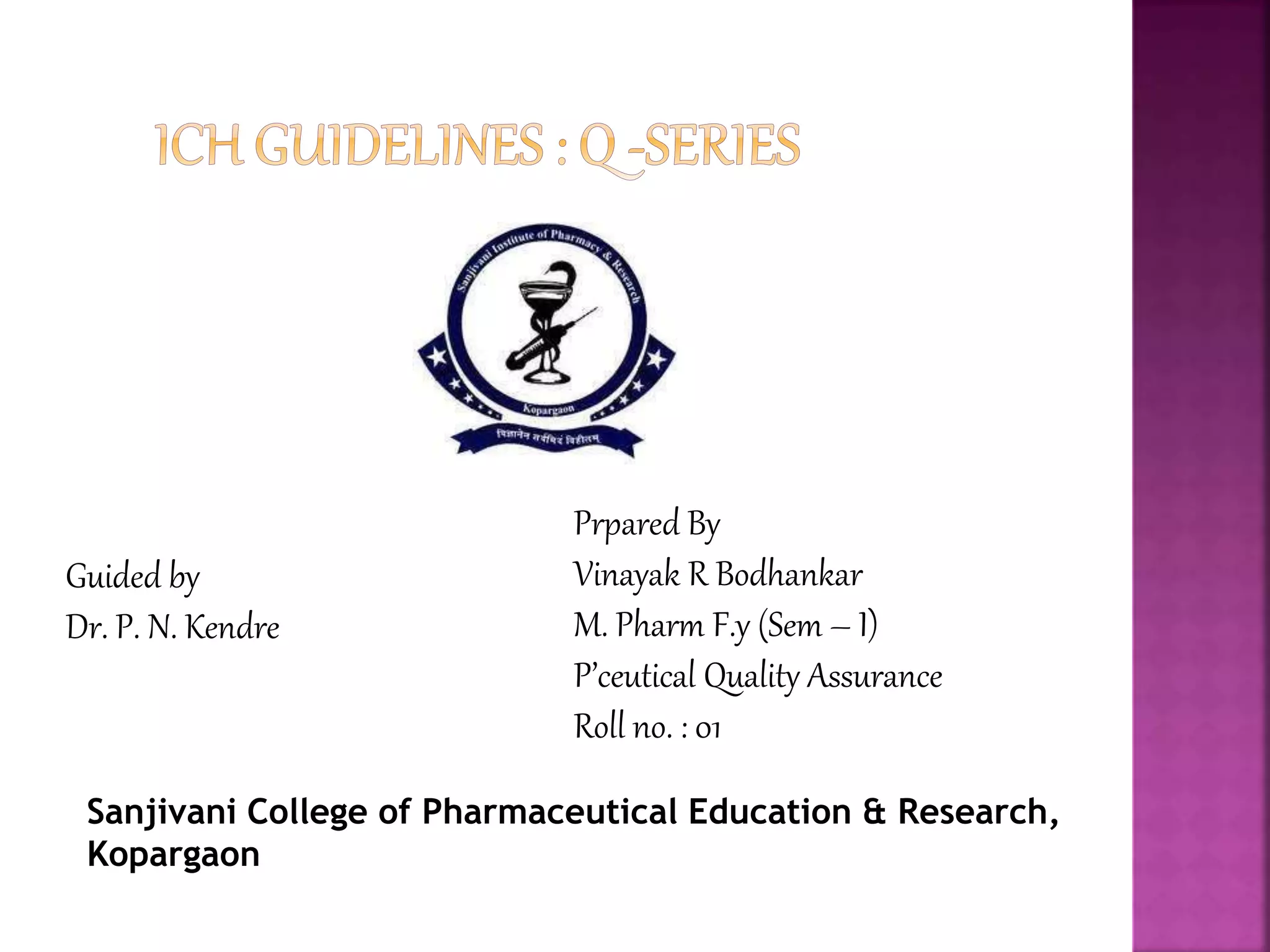 This document provides an overview of ICH guidelines related to quality (Q series). It describes the composition and objectives of ICH, which aims to harmonize technical requirements for pharmaceutical registration among regulators and industry in the EU, Japan, and US. The key points are that ICH guidelines are divided into four categories, including the Q series which relates to chemical and pharmaceutical quality. The Q series guidelines cover topics like stability testing, analytical validation, impurities, and residual solvents. The goal is to establish common standards for assessing safety, quality and efficacy of medicines.