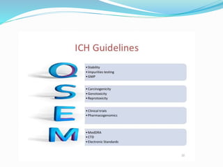 The document discusses the objectives and guidelines of the International Council for Harmonization (ICH) for stability testing of pharmaceutical products. It provides an overview of the key ICH guidelines for stability testing (Q1A-Q1F) and describes the principles of stability testing including establishing re-test periods and shelf lives. It also discusses the different types of stability testing, protocols, study designs like bracketing and matrixing, and key parameters for evaluation.