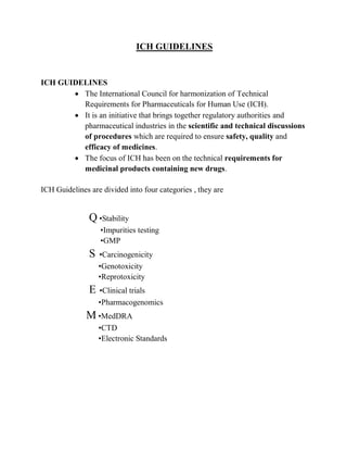 The document discusses the International Council for Harmonisation (ICH) guidelines related to pharmaceutical quality assurance, covering areas such as stability testing, impurities, good manufacturing practices, and clinical trial safety. It details the various categories and specific guidelines within quality, safety, and efficacy to ensure the safety, quality, and efficacy of medicines. Furthermore, it outlines essential considerations for regulatory compliance and risk management in the pharmaceutical industry.