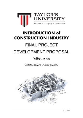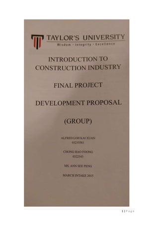 This document provides details of a proposed construction project to build a food court on a vacant plot of land in Bandar Mahkota Cheras, Selangor, Malaysia. The site was chosen for its strategic location near residential and commercial areas. The proposed food court is intended to provide a gathering space for nearby residents to relax and socialize while enjoying a variety of international foods. The design aims to create an open-air environment with natural landscaping elements. Professionals such as architects, engineers and contractors will be involved to design, plan and build the project.
