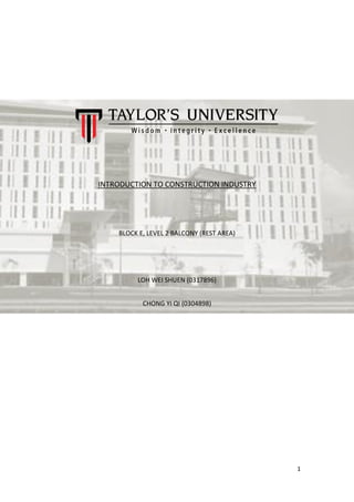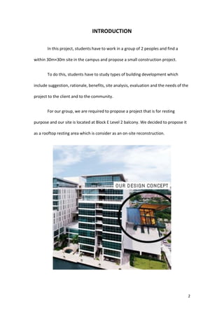 This document proposes constructing a rooftop resting area on an unused balcony at Block E, Level 2 of the campus. A site analysis found the space receives sunlight after 11AM and has low noise. The concept is to transform the concrete space into a relaxing natural environment with landscaping, seating, and a corridor allowing socialization. Justification cites utilizing the unused space and addressing the heat issue. The proposal includes cost estimates for materials, construction, and maintenance totaling over RM200,000. The conclusion is that the design would provide a comfortable space for users while requiring ongoing maintenance costs.