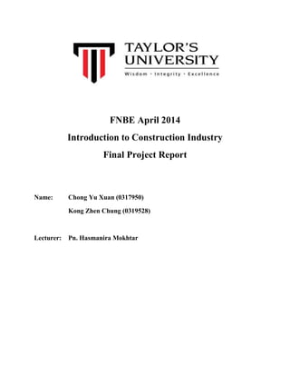 This document provides a summary of a final project report for a proposed construction of a 24/7 food and beverage area at Taylor's Lakeside Campus. It includes an introduction of the project and group members, a site analysis of the proposed location, sketches of the site plan and floor plan, and a discussion of the authority procedures and estimated costs for the project. The proposed area would provide economical and healthy food options for students on the campus.