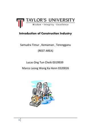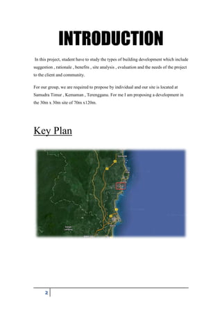 The document summarizes a proposal for developing a recreational area at a site in Samudra Timur, Kemaman, Terengganu, Malaysia. The proposed development would include creating an open park surrounded by trees, with a man-made lake and walking paths. A wooden gazebo made of durable walnut wood would be constructed near the walking path to provide a resting area. The recreational area aims to provide a comfortable outdoor space for nearby residents to relax and exercise in a natural environment.
