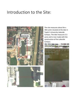 The document proposes building a suspension bridge at Taylor's University Lakeside Campus to improve accessibility and walkability. The 30m long bridge would connect Block E to the commercial block and feature three glass capsule cafes that could be rented. This would shorten the walking time to the commercial block from 5 minutes to 1 minute. The bridge would benefit the university, students, and cafes by generating income, providing a new gathering space, improving access to facilities, and enhancing the scenery.