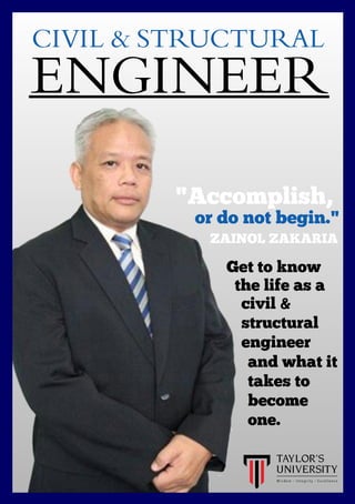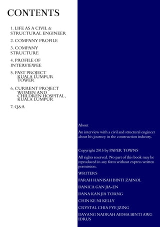 This document contains an interview summary with a civil and structural engineer named Zainol Bin Zakaria. It discusses his career journey and involvement in major projects over 28 years, including the Kuala Lumpur Tower and the current Women and Children's Hospital project in Kuala Lumpur. The interview also addresses qualities needed in structural engineering, his greatest career achievement completing a project ahead of schedule, challenges faced on different projects, and his advice for future civil and structural engineers.