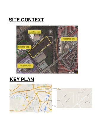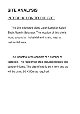 The site is located along Jalan Lengkuk Keluli in Shah Alam, Selangor near an industrial area and residential neighborhood. It is 60m by 70m in size. Surrounding land use includes factories, houses, and condominiums. The proposal is to build a two-story commercial building with two futsal courts on each floor, as well as a cafeteria, equipment shop, locker rooms, and parking area. The building aims to encourage a healthy lifestyle and provide a place for local residents and the public to play futsal.