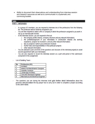This document provides details for Project 1B, which is part of the Introduction to the Construction Industry course. The project focuses on identifying the specific roles of building teams in the construction industry. It is worth 30% of the course grade, with 30% based on group work and the remainder on individual performance via peer assessment. The project aims to develop an understanding of building teams, their organization, duties, responsibilities, and interrelationships. It also aims to develop awareness of professional responsibilities and how different professions fit within the construction industry. Students must document their observations from interviews and research in an A5-sized, colored magazine between 8-12 pages along with a CD of interview recordings and the magazine in PDF format. The submission deadline
