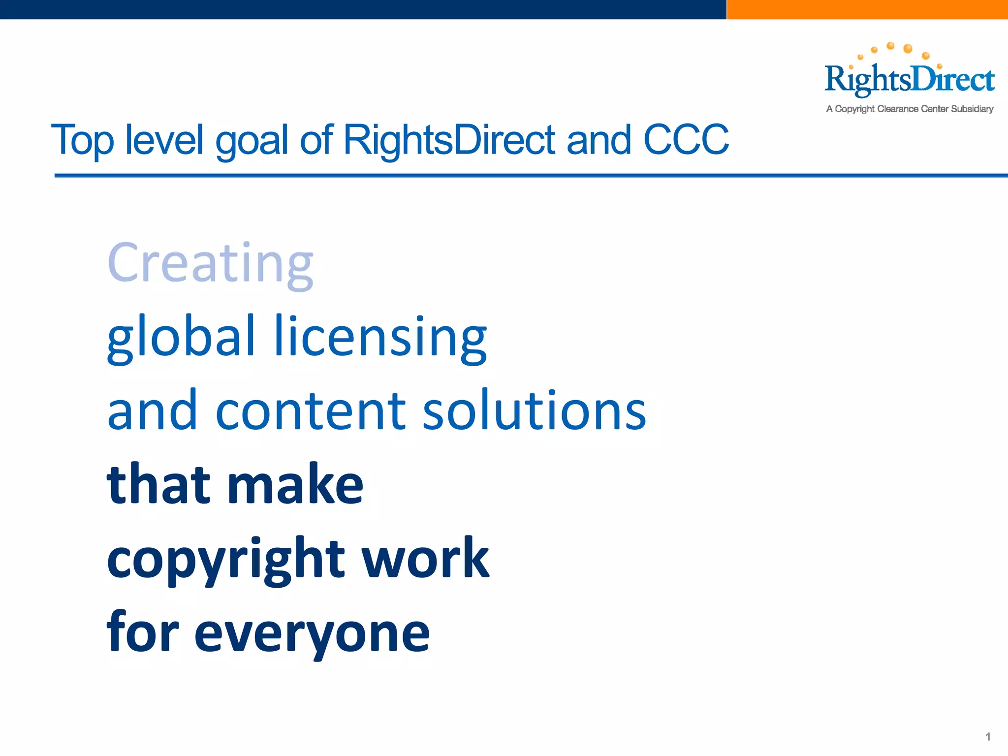 RightsDirect provides global licensing and content solutions to make copyright work for everyone. It offers licensing solutions, rights management, and other services to rightsholders and publishers. For content users, it provides document delivery, text and data mining, and enterprise content management services to organizations through solutions like RightFind and a Multinational Copyright License to simplify access and sharing of copyrighted materials. The license helps fill gaps in coverage from individual publisher licenses by allowing storage, sharing, and other uses of electronic articles across borders according to a consistent set of rights.
